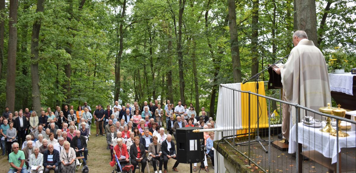 Obwohl es kurz vor dem Festgottesdienst auf dem Annaberg noch regnete, zog es wieder viele Gläubige auf den “wunderbaren Hügel”, wie ihn der Ruhestandspfarrer Ludwig Gradl nannte. Er entschuldigte Pfarrer Daniel Fenk, der bei der Ministranten-Wallfahrt in Rom ist. Pfarrer Gradl freute sich, dass er, als Eschenbacher, die Festpredigt vor der Maria-Hilf-Kirche halten durfte. Dazu begrüßte er auch die Schülerjahrgänge 1958/59 und 1932/33. Mitzelebrant war Pfarrer Hans Bayer.