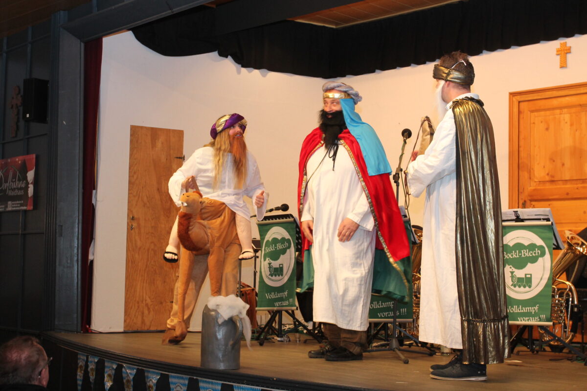 Mit Sketchen wie „Das Geburtstagsgeschenk“, „Szenen an der Bushaltestelle“ und „Das verschwundene Kind“ sorgten die Darsteller der Dorfbühne für ausgelassene Heiterkeit. Der Höhepunkt des humorvollen Programms war der Sketch um „Die vier heiligen drei Könige“ beziehungsweise „Die so gut wie vier Weisen aus dem Morgenland“. Diese humorvolle Interpretation sorgte für Lachsalven und tosenden Applaus im Publikum, eine Anerkennung für die Akteure auf und hinter der Bühne.