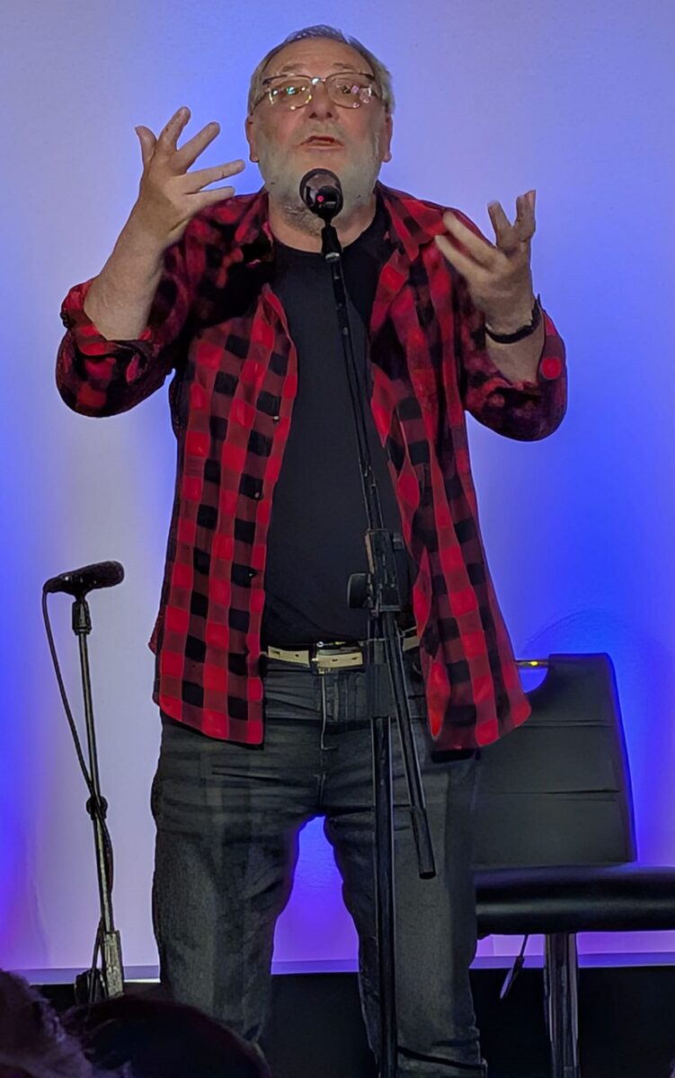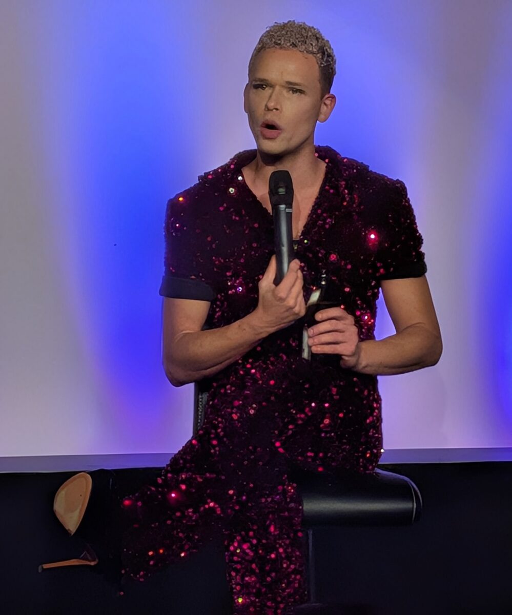 Der aus Köln angereiste Tobi Born präsentierte sich im stilvollen Glitzerlook. Er macht keinen Hehl daraus, dass er anders ist als die anderen, setzt kraftvolle Zeichen gegen patriarchale Strukturen und kämpft für mehr Feminismus in der Gesellschaft. Der Rheinländer interagierte mit dem Publikum, auch wenn sprachliche Barrieren nicht von der Hand zu weisen waren. Voltaren ist die neue Droge der Senioren, war von einem vorderen Tisch zu hören. Als bei der Rückfrage von Tobi Born die Ergänzung dazu kam: „Da muss man auch nichts schlucken“, bebte die Halle und der Künstler bekam selbst einen Lachflash.