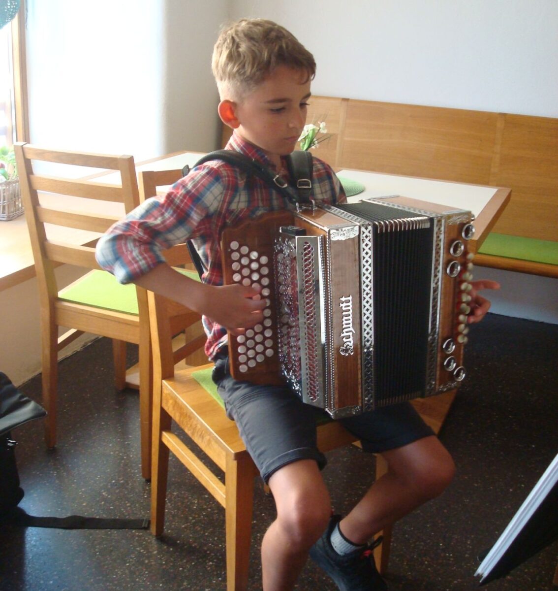 Der Referent präsentierte noch weitere Deasgeschichten wie zum Beispiel die endlose Fahrt im Karussell – Reitschell im Dialekt. Der elfjährige Max Haberkorn aus Pleußen leistete mit seinen Akkordeonvorträgen einen wichtigen Beitrag zum Gelingen dieses literarischen Abends.