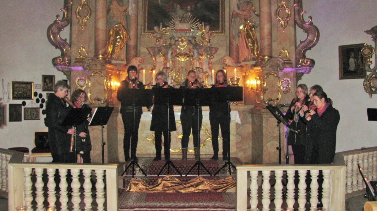 Das Ensemble startete mit zwei Solisten und einem zarten „Maria durch ein Dornwald ging“. Danach sang es ein beschwingtes und kräftiges „Joy to the Word“. Anschließend glänzte „Flautista“ mit „Concertino / Satz Nummer 1“. Dann erklang von den Flötenspielerinnen eine steirische Advents- und Weihnachtsmusik. Nach dem „Aufmarsch der Hirten“ spielten sie die „Botschaft der Engel“. Daraufhin erfreute „ChorDiSono“ die Gäste mit dem „Wiegenlied“ (Christmas Lullaby) und „Do you hear what I hear“. Stimmung und Schwung ließen die Sänger mit den Liedern „Santa Claus is coming to Town“ und „Glorious Kingdom“ aufkommen. Einen krönenden Höhepunkt gestalteten die Flöten mit „Tochter Zion“. Zum Abschluss sangen der Chor und die Zuhörer, von den Flöten begleitet, gemeinsam „Macht hoch die Tür“.