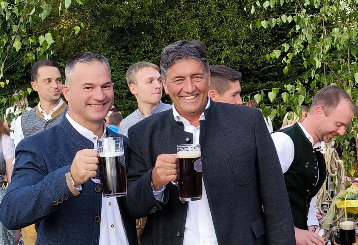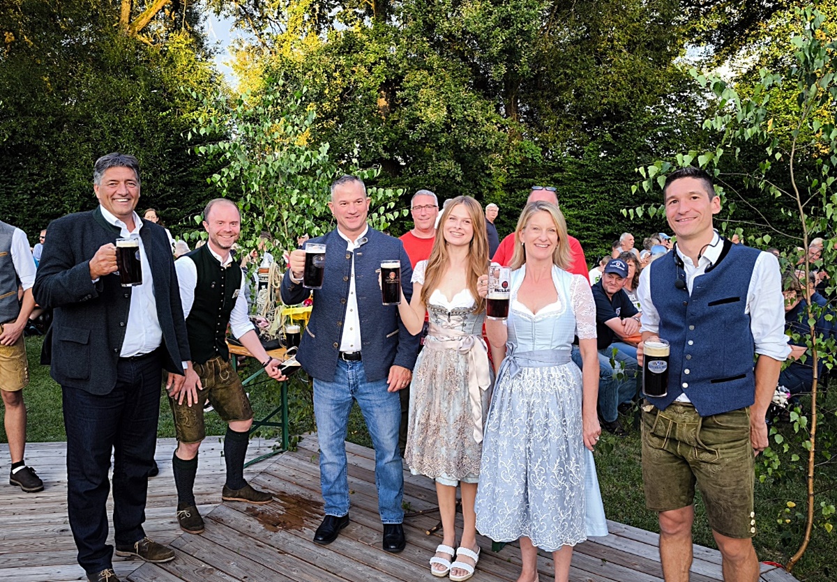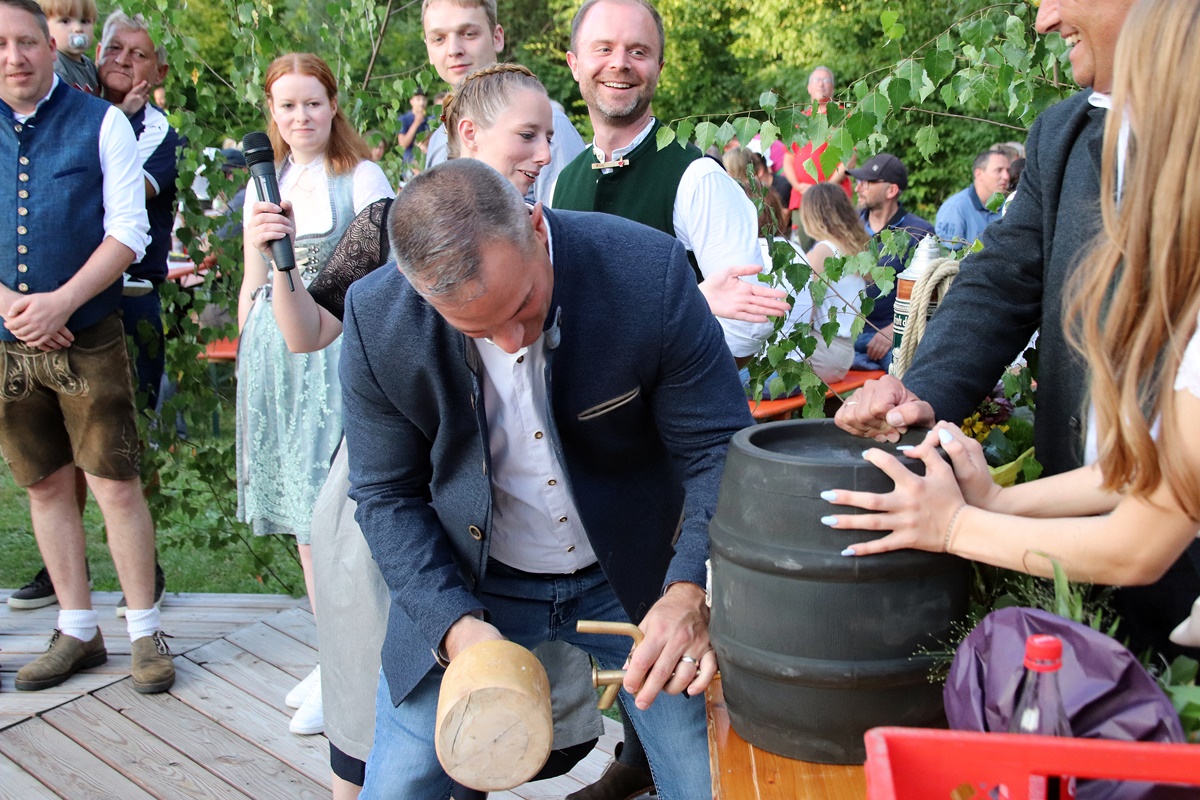 Nachdem auch das Bierfass in Stellung gebracht wurde, durfte Brigadegeneral Steven P. Carpenter vom 7. US-Armee Ausbildungskommandos in Grafenwöhr das Fass anstechen. Er war zusammen mit dem neuen Kommandeur der US-Armee Garnison Bavaria, Oberst Stephen C. Flanagan, nach Hütten gekommen. Carpenter benötigte, wie auch bereits im vergangenen Jahr, nur einen Schlag zum Anzapfen.