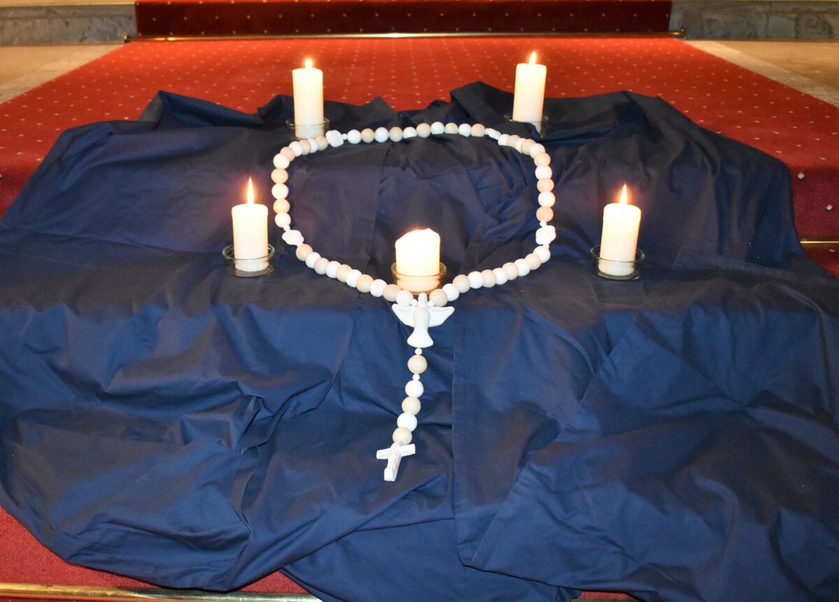 “Neben Ihren eigenen Anliegen beten Sie bitte auch für die Menschen in den Kriegsgebieten in der Ukraine und im Nahen Osten” bat Pfarrer Daniel Fenk vor Beginn des Oktoberrosenkranzes in der Friedenskirche. Roswitha Heining hatte zum Gebet und den Liedern zur Gottesmutter Maria einige Impulse.