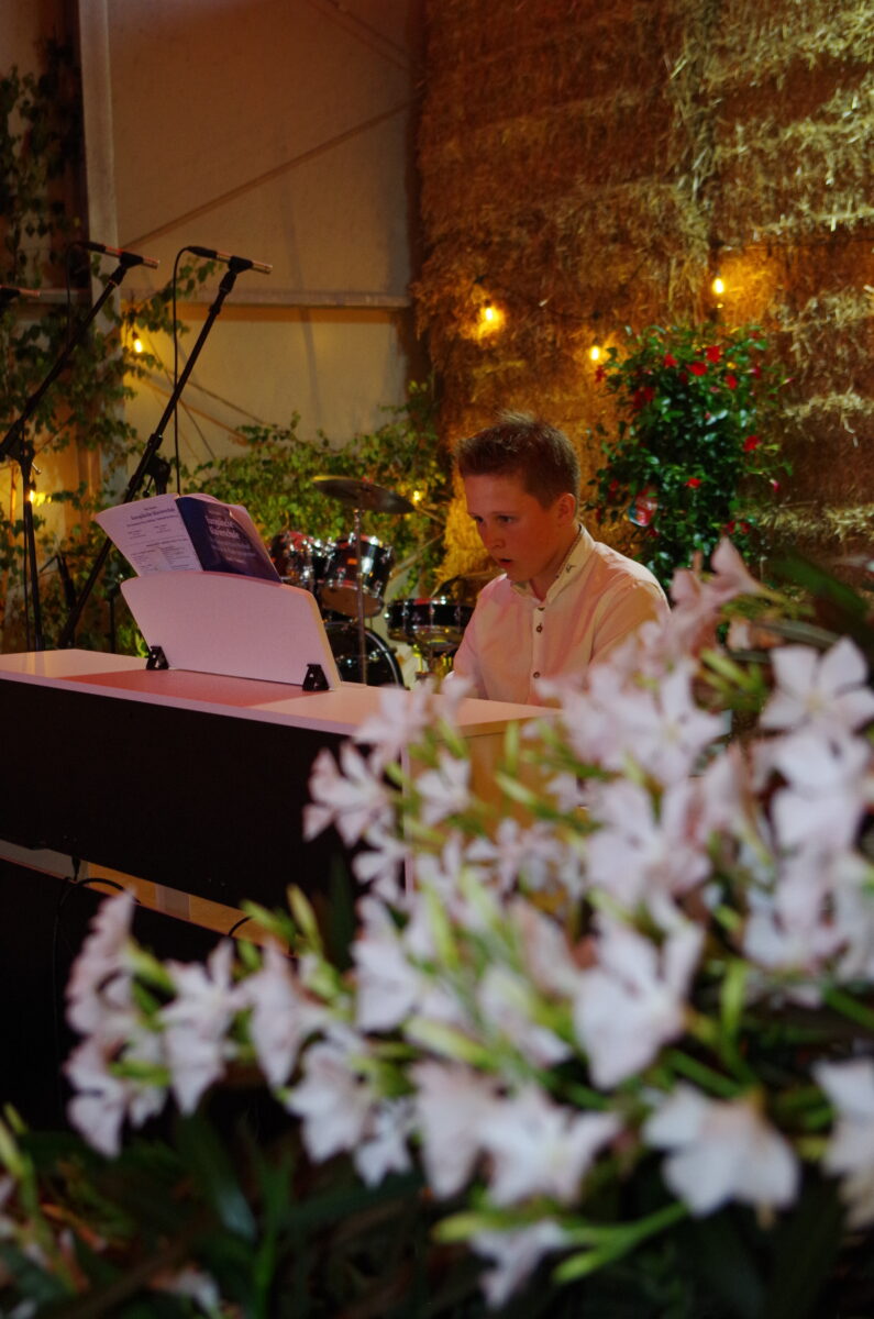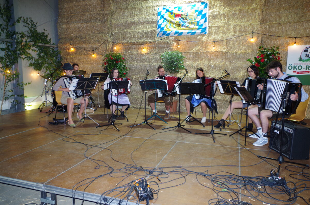Am Samstagabend fand ein Konzert an einem besonderen Ort statt. Die Kreismusikschule Tirschenreuth wechselte von einem Konzertsaal in eine Maschinenhalle der Familie Zahn in Eiglasdorf. Ideengeber zu dieser ungewöhnlichen Kombination waren Bio-Landwirt Matthias Zahn selbst und die Öko-Modellregion Steinwald. Erstmalig im Landkreis Tirschenreuth wurde so ein außergewöhnliches Konzert durchgeführt – mit Erfolg. Es kamen trotz großer Regenmengen am Nachmittag und Abend viele Besucher und lauschten den Programmbeiträgen. Bereits am Freitag fiel die Entscheidung der Familie Zahn, das Konzert auf ihrem Bio-Hof wetterbedingt in die Maschinenhalle zu verlegen, zu Recht! Diese wurde mit einer Stroh-Bar, vielen Lichterketten und dezentem Blumenschmuck zu einem stimmungsvollen Ambiente für den Abend umgewandelt.