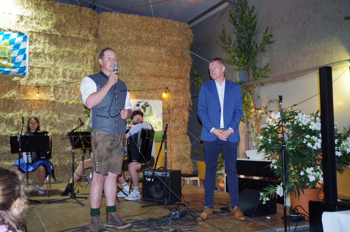Zum Schluss wurden alle Darbietungen mit viel Applaus und Standing Ovations gewürdigt. Da der Eintritt frei war, wurden auf freiwilliger Basis Spenden gesammelt, die an die Palliativstation in Weiden gehen. In ihrer Verabschiedung zeigten sich Matthias Zahn und Tobias Böhm begeistert von der positiven Resonanz der Besucher zu diesem schönen und etwas anderen Konzertabend. Zahn dankte vor allem seinen zahlreichen Helfern im Freundeskreis, die tatkräftig seine Maschinenhalle gemütlich und festlich hergerichtet haben. Besonders dankte er seiner Familie und seiner Frau für die Unterstützung: „Weil du immer jeden Mist mitmachst, den ich so anschleppe!“, so beschloss der Hofbesitzer das unvergessliche Erlebnis des ersten Bio-Hofkonzerts.