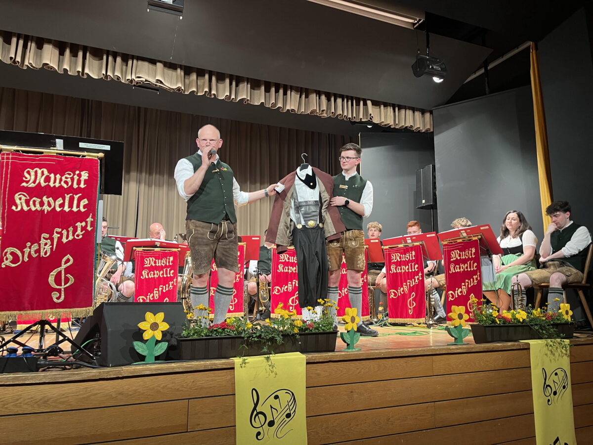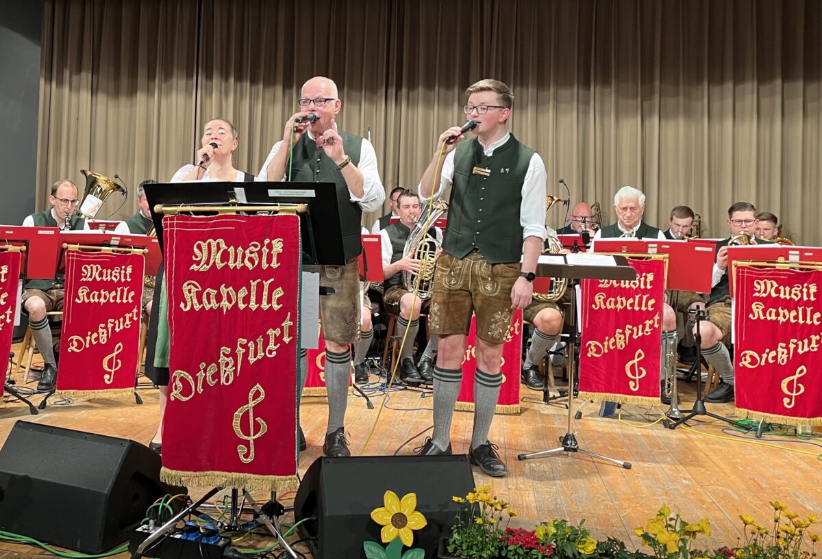 Besonders stolz sind die Dießfurter, die es seit 102 Jahren gibt, auf ihre Verjüngung, die auch größten Teils aus den eigenen Reihen im Dorf kommt. Chef der Truppe und Dirigent in dritter Generation ist der erst 23jährige Jonas Schreml. Er hatte seine Musiker präzise im Griff und führte und dirigierte sie ganz im Stil von Ernst Mosch, mit Gefühl und großer Bühnenpräsenz. Das Musizieren und Dirigieren ist dem jungen Dießfurter dabei in die Wiege gelegt. Vorgänger waren sein Vater Werner Schreml und Opa Werner Wolfbauer, die nun beide am Tenorhorn und an der Trompete dem Taktstock und Vorgaben des jungen Talents folgen.