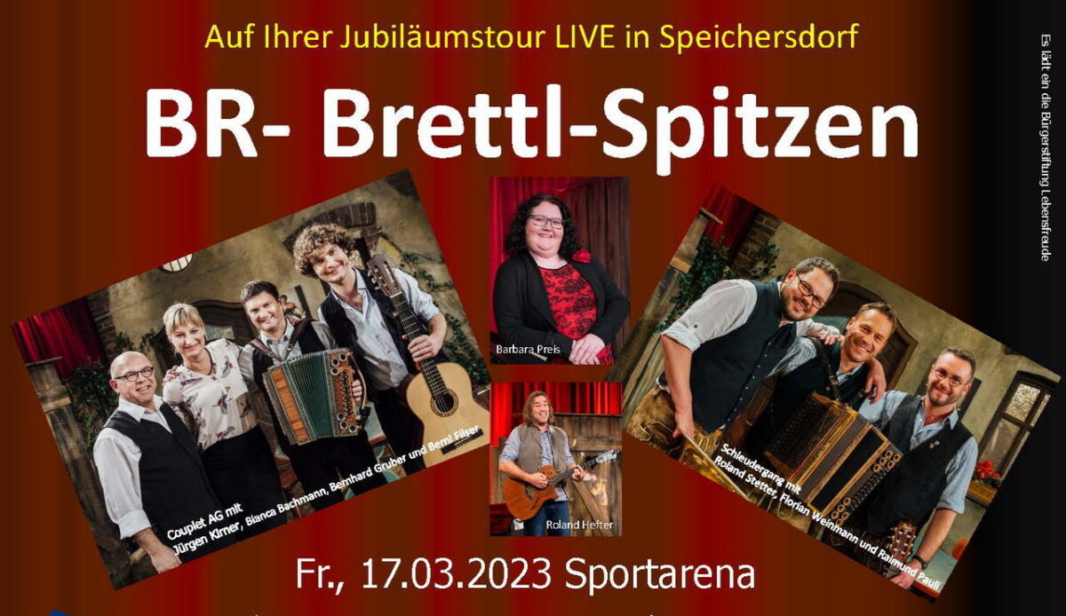 Die BR-Brettl-Spitzen machen am 17. März auf Einladung der Bürgerstiftung Lebensfreude auf ihrer großen Jubiläumstour 2023 – 10 Jahre LIVE Station in der Sportarena. Erstmals gibt es die fernsehbekannten Künstler und Newcomer um den künstlerischen Leiter Jürgen Kirner aus der erfolgreichen Sendung im Bayerischen Fernsehen hautnah in einem einzigartigen Programm zu erleben. Ein Feuerwerk der Unterhaltungskunst und das natürlich in absoluter Starbesetzung erwartet die Gäste an diesem Abend.