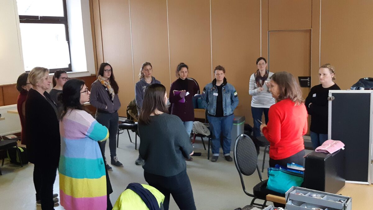 Die Referentin Anja Schnatmann erklärte anhand praktischer Umsetzung, wie man ein Bühnen-Make-Up an die Schauspielerin und an den Schauspieler bringt. Nachdem sie es ausführlich und deutlich gezeigt hatte, durften die Teilnehmerinnen und Teilnehmer selbst ran. Zu zweit schminkten sie einander, hier kamen unterschiedliche Ergebnisse und Talente zum Vorschein. Anschließend wurden die fertigen Masken auf der Bühne präsentiert, um den Unterschied vom Spiegel zur Entfernung zu erkennen.