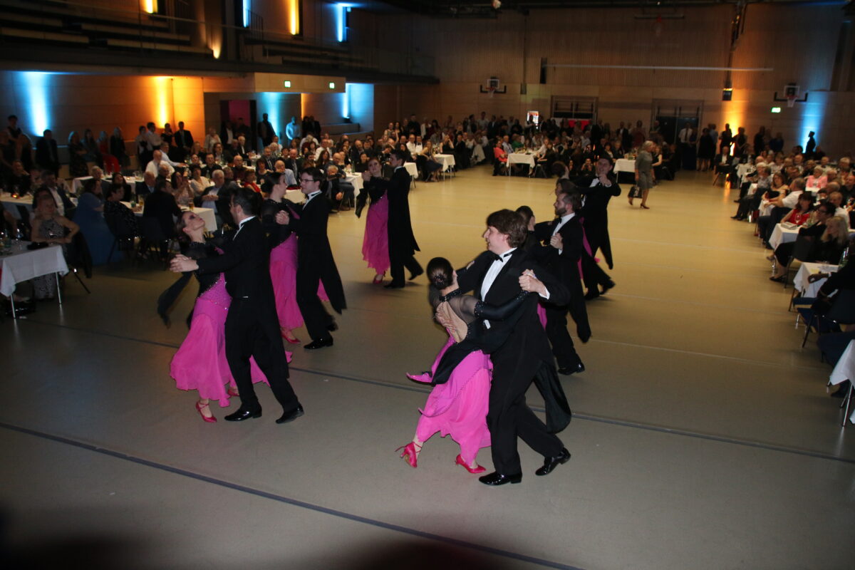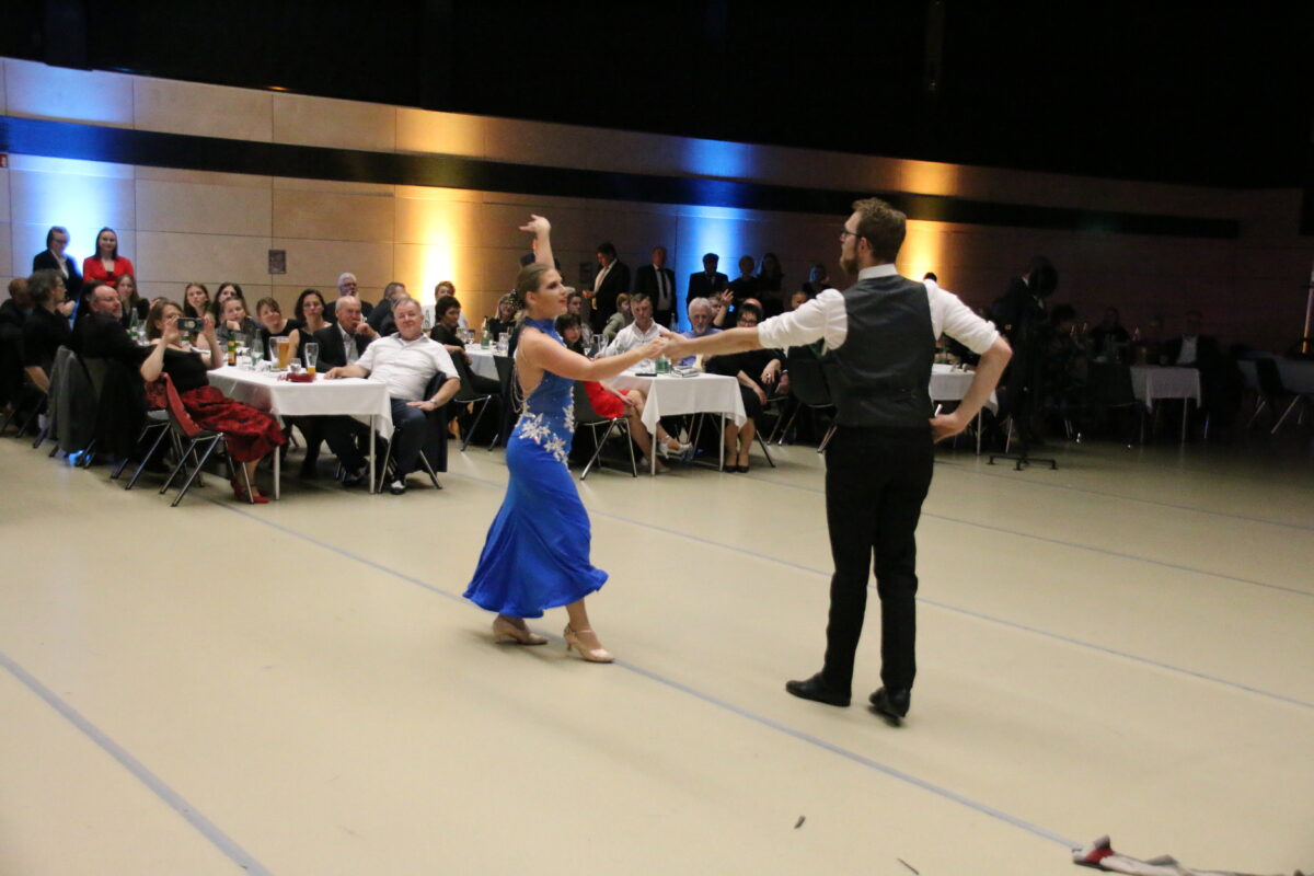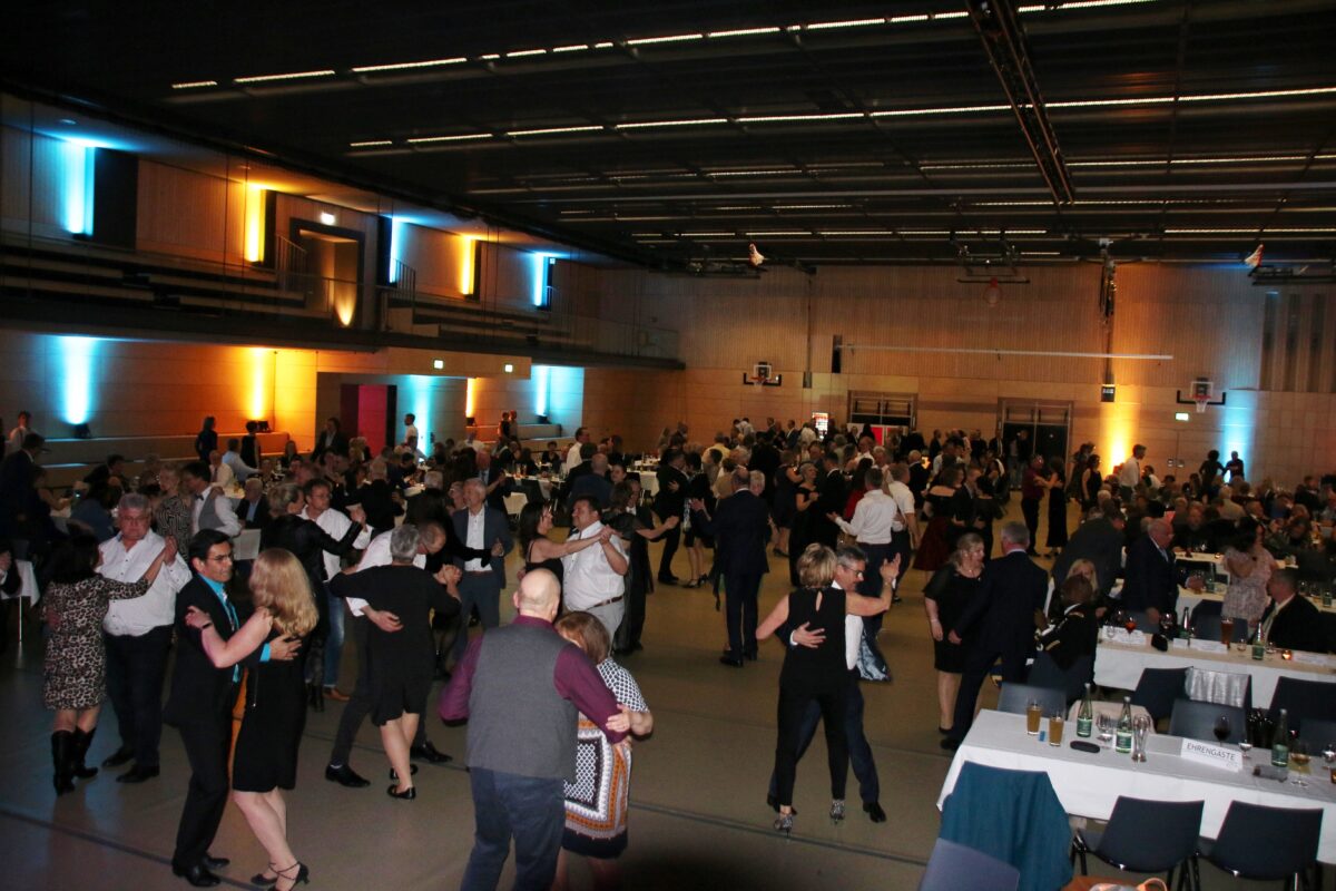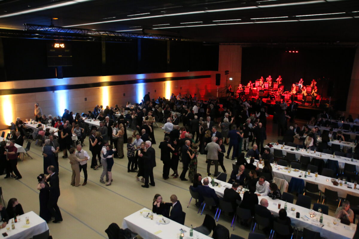 So konnten schnell die Tanzrunden eröffnet werden. Zur Musik der OM-Big Band mit Musikern aus der Oberpfalz war die Tanzfläche ständig mit dutzenden Tanzpaaren belegt. Um den neuen Boden zu schonen, wurde extra eine spezielle Oberfläche für Veranstaltungen ausgelegt. Dieser passte gut zum Ambiente der Stadthalle.