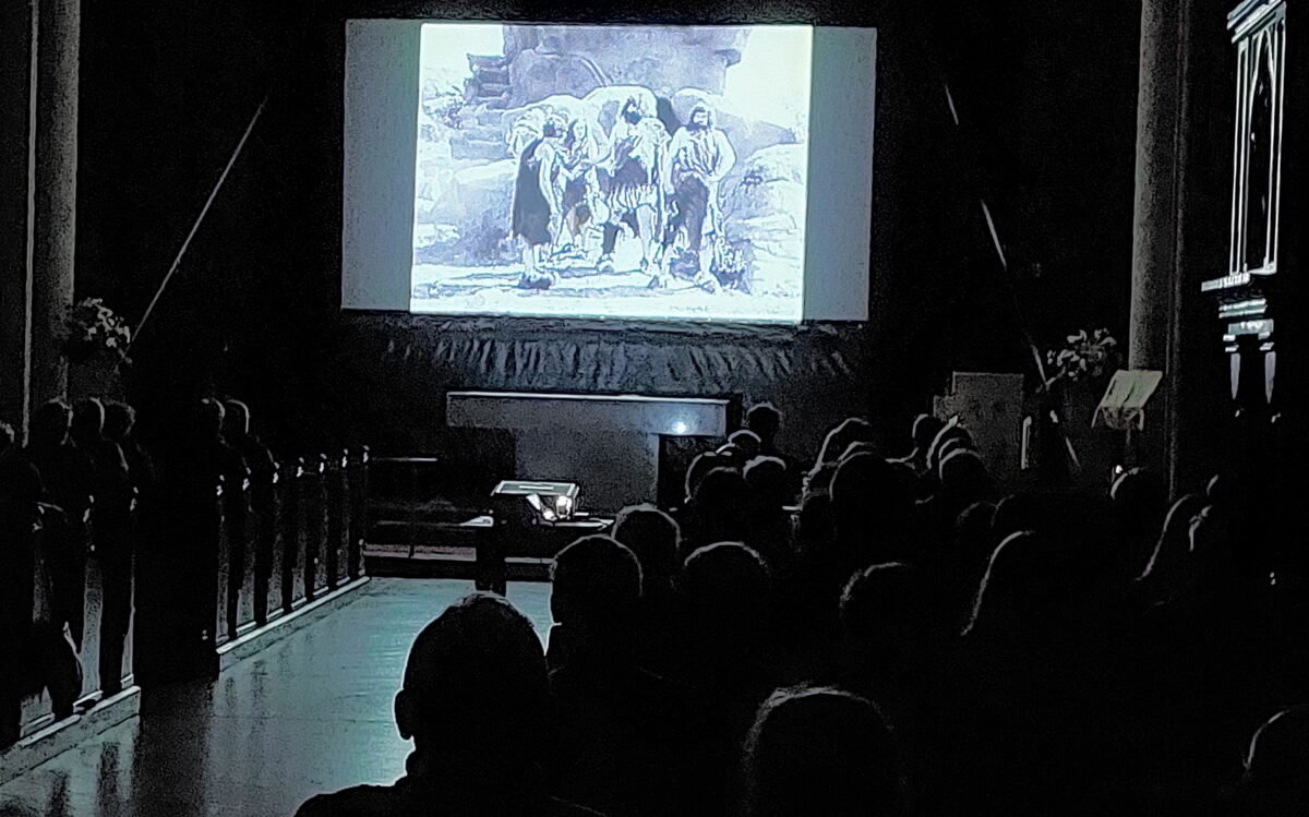 Ein ganz besonderes Kinoerlebnis erwartete die Besucher am Freitagabend in der Josefskirche: Im völligen Dunkel verwandelte sich das Gotteshaus in einen Kinosaal der 1920er-Jahre. Über eine Leinwand im Altarraum flimmerte Buster Keatons erster abendfüllender Spielfilm “The Three Ages” aus dem Jahr 1923- Es war ein schwarz-weißes Meisterwerk der Komik, das die Liebe in drei Epochen erzählt: in der Steinzeit, im alten Rom und in den wilden Zwanzigern.