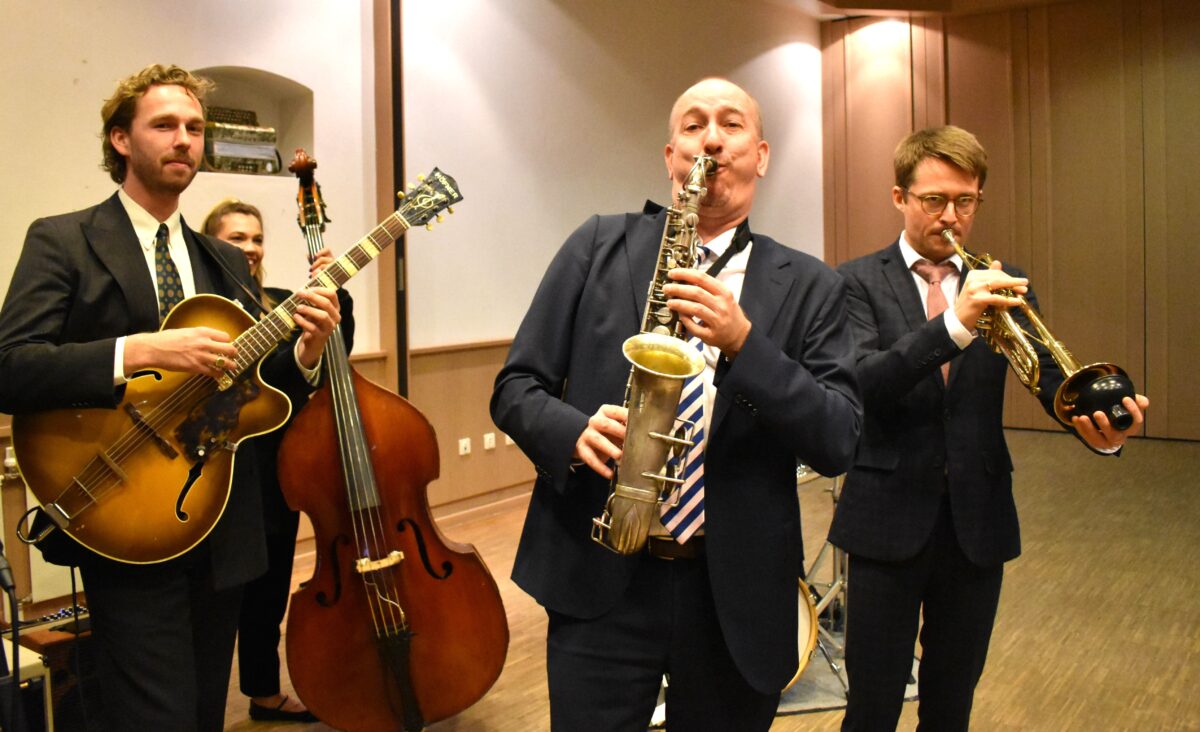 Thimo hat den „Young Talent Award“ gewonnen, war schon mit der „Glenn Miller Band“ unterwegs und hat eine Südkorea-Tournee hinter sich. Im Konzert konnte man ein Stück aus dem Repertoire von Louis Armstrong bewundern. Tijn ist nicht nur Gitarrist, sondern ein charismatischer Vocal-Star aus den Niederlanden im lässigen Sinatra-Style. Er bezauberte die Zuhörer mit seiner wundervollen Stimme. Aktuell macht er eine bemerkenswerte Solo-Karriere als Jazz-Star in Asien. Caris wurde mit dem WDR-Jazzpreis ausgezeichnet, spielt in verschiedenen Bands sowie in der WDR-Bigband.