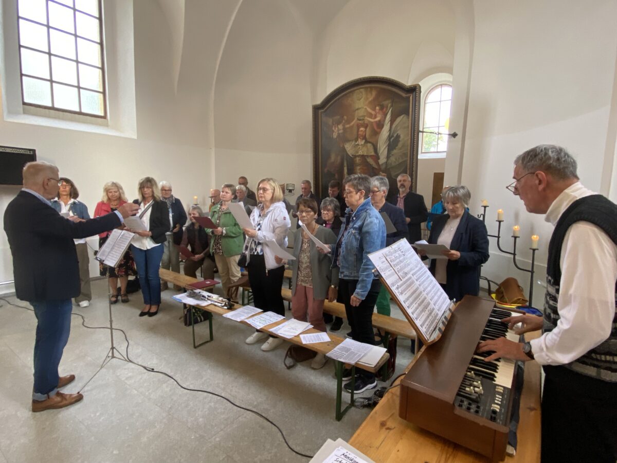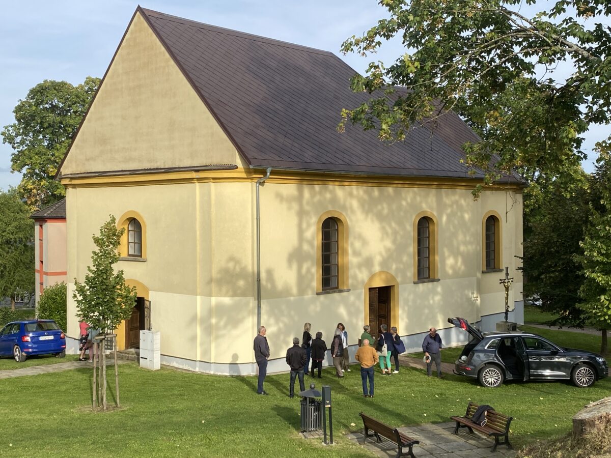 Nach einer kurzen Fahrt über die Grenze zur sehr gepflegten Kirche, die nur mit einem Bild des Kirchenpatrons Wenzeslaus und dem Ortswappen ausgeschmückt ist, erfuhren die Sängerinnen und Sänger auch einiges über die bewegte Geschichte des Gebäudes, das Anfang des 20. Jahrhunderts gebaut wurde. Nach den Wirren des Zweiten Weltkrieges kam das Gotteshaus immer weiter herunter, wurde sogar als Heuschober verwendet und drohte einzustürzen.