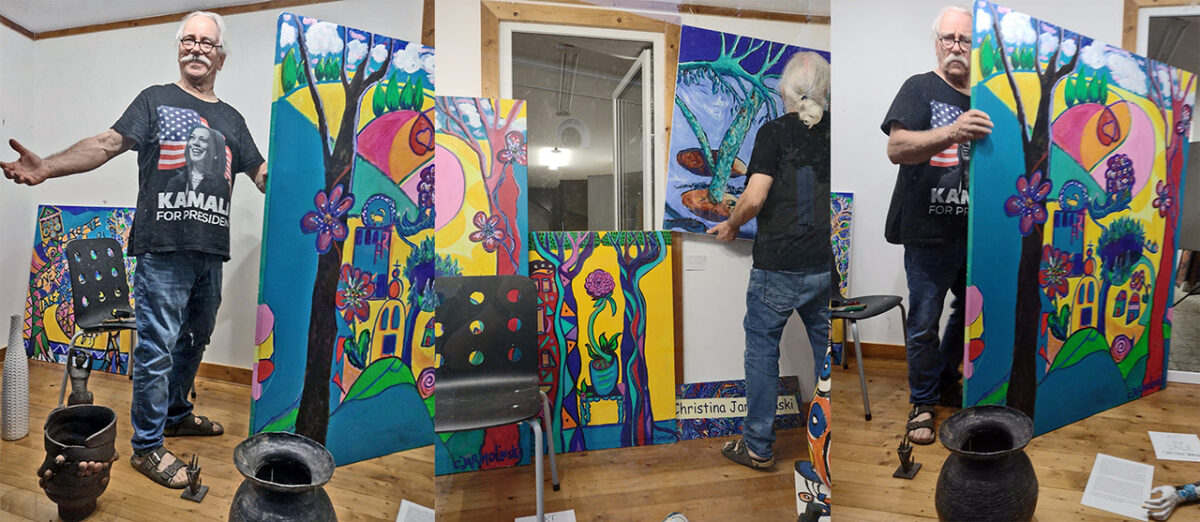 Wer aber weiß schon, dass sich gegenüber der Pfarrkirche St. Michael auf dem Marktplatz 7 ein Blick in das Schaufenster der wunderbaren Pop-Art-Welt von Christina Jarmolinski, einer US-amerikanischen Künstlerin mit oberbayerischen Wurzeln, eröffnet? Da stehen sie nun, Christina und ihr niederländischer Freund Rob de Koter, Fotograf, inoffizieller Manager und Sanierungsbeauftragter des neuen Tännesberger Ateliers, in ihren Kamala-Harris-T-Shirts und strahlen um die Wette.