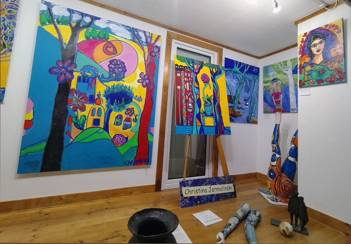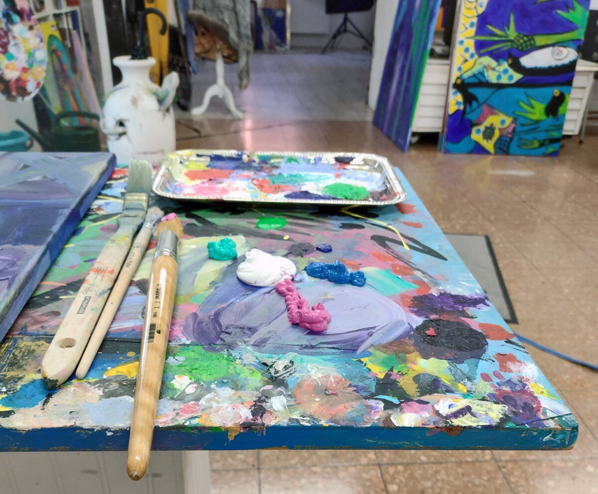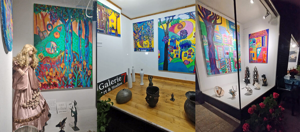 Hinter der mit Lebensbäumchen und Rosen geschmückten Fassade verbirgt sich ein knallbuntes, kreatives Chaos mit zahllosen, großformatigen Gemälden an den Wänden und hintereinander gestapelt auch am Boden. Dazwischen Skulpturen, Kunstobjekte, lebensgroße Schaufensterpuppen, Vasen, selbst entworfener Schmuck, Tassen mit Kunstmotiven, Staffeleien, Tischen und Regalen, die sich unter der überbordenden Last von Farbflaschen und Tuben, Terpentin und Pinseln biegen.