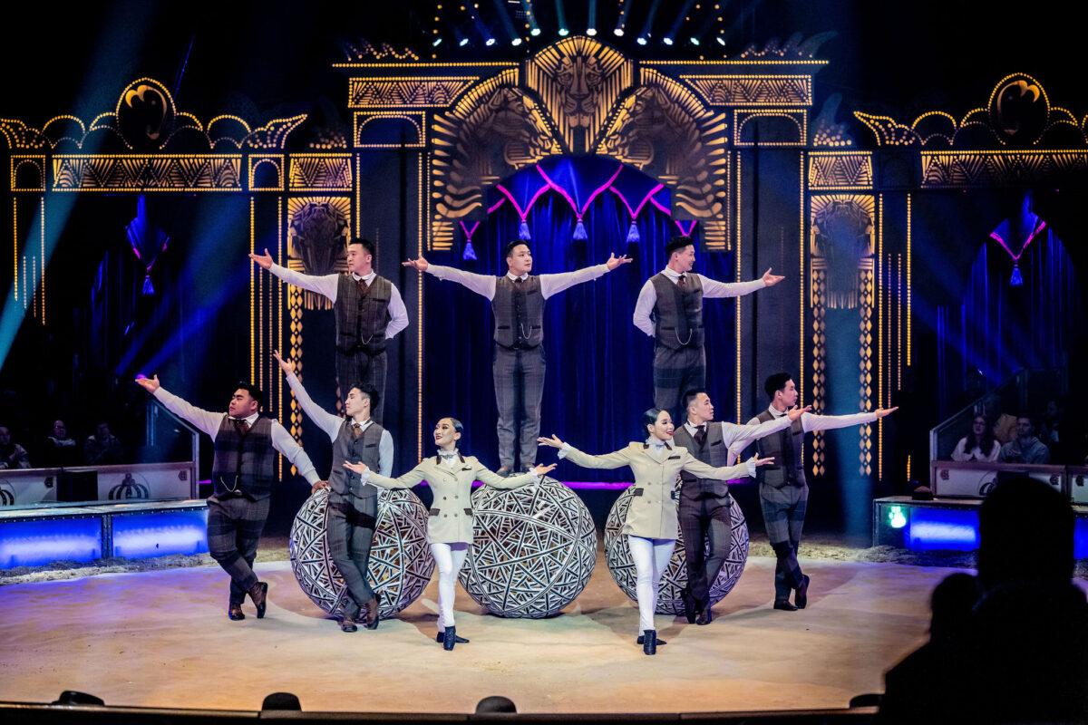 Sie suchen die ultimative Herausforderung und finden diese in den Handvoltigen auf großen, weißen, rollenden Kugeln. Das ist neu und einzigartig. Gekonnt schleudern sich sieben Männer und eine Frau gegenseitig durch die Luft und nutzen die Kugeln als Plattform für kraftvolle Voltigen. Mit beeindruckender Balancekunst und Konzentration katapultieren sie sich – allein durch die Kraft der Untermänner – bis auf Zwei-Mann-Hoch. Diese achtköpfige Truppe des Starartisten, Choreografen und Produzenten Erdene Nergui ist aus der Mongolei angereist.