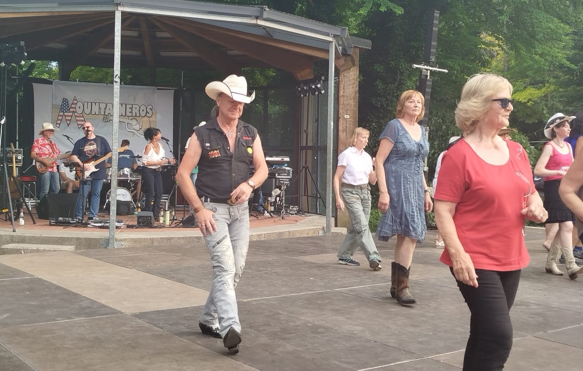 Country-Musik bei 32 Grad in Schatten. Eine Hitze wie in Texas. Die Boots der Line-Dancer-Boots hätten den sandigen Dancefloor vor dem Max-Reger-Park-Pavillon zur Staubwolke verwandelt, wäre der nicht aus Holz gewesen. Viele Freunde der Weidener Sommerserenaden verfolgten am Mittwochabend den tollen Auftritt der “Mountaineros”. Viele erinnerten sich noch an den legendären ersten Auftritt der Combo anlässlich der Jubiläumsfeier von Bruno Wilfarths Country-Sendung bei “Ramasuri”.