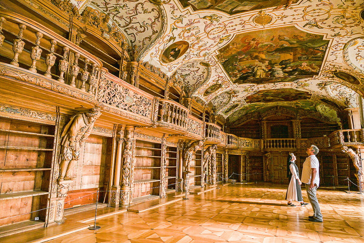 Es ist, als öffne sich ein Vorhang zur Bühne einer geistigen Welt. Wir treten in die berühmte Stiftsbibliothek – jenen Saal, der 1724 bis 1746 unter Abt Eugen Schmid kunstvoll ausgebaut wurde. Die Stuckdecke, gestaltet vom italienischen Meister Jacopo Appiani, scheint sich in Bewegung zu setzen: Ein goldenes Band – das sogenannte Bandelwerk – schlängelt sich durch die Kuppel, umrahmt von Engeln, exotischen Tieren, Drachen, Greifen und Sphingen, die wie im barocken Theater auf ihren Auftritt lauern.