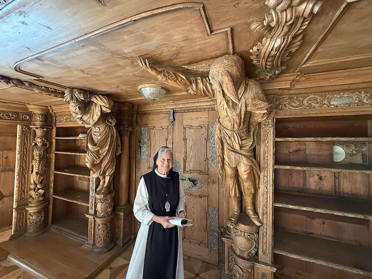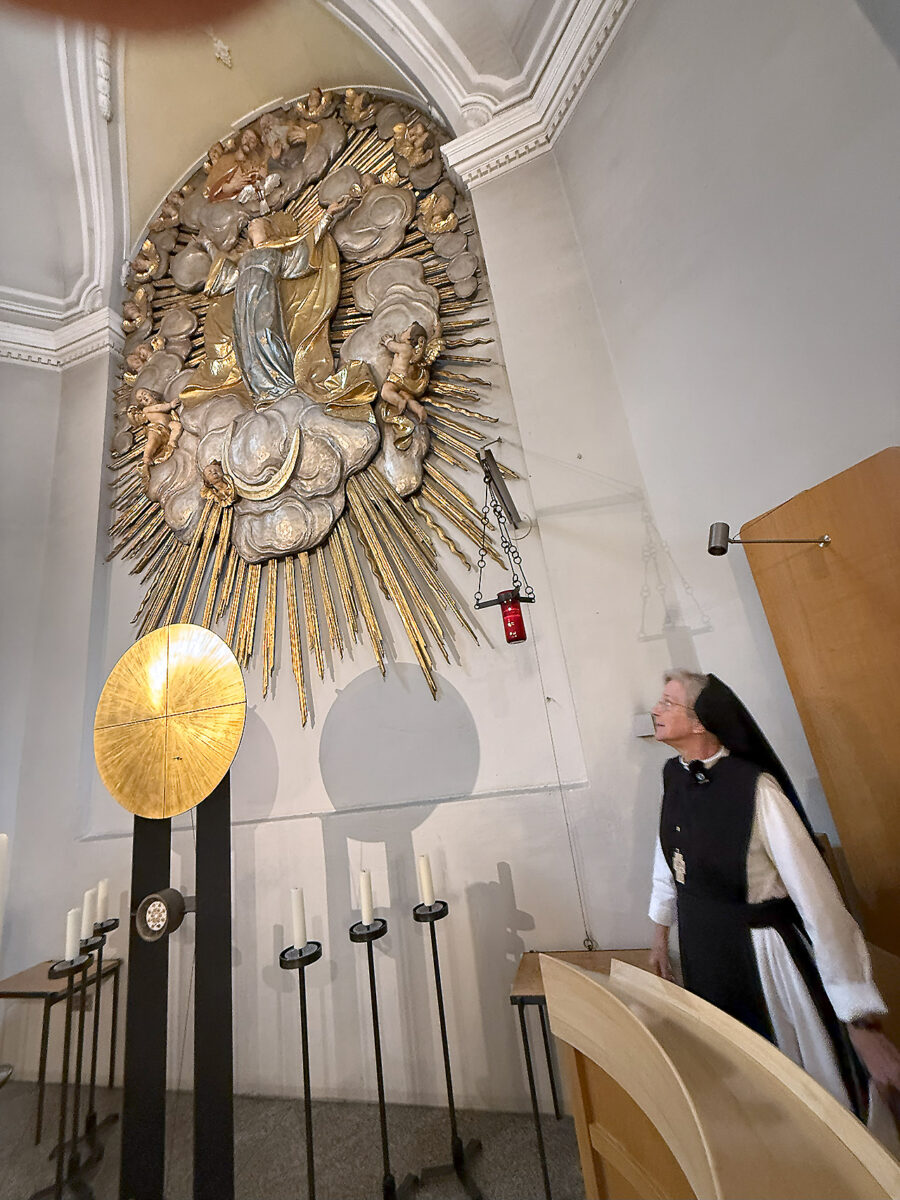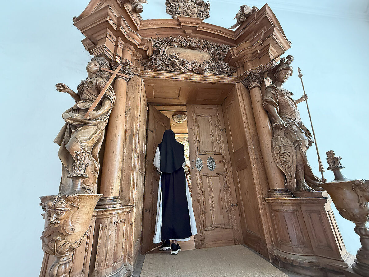 Äbtissin Laetitia Fech schreitet voran und wir schleichen ehrfürchtig hinterher: In einen Raum, der mit kunstvoller Ironie, feinsinniger Frömmigkeit und überwältigender Bildsprache das Denken und Fühlen einer ganzen Epoche bündelt. Wer zwischen den vergoldeten Balustern steht, begreift: Wissen kann heiter sein – und Heiligkeit hat Humor.