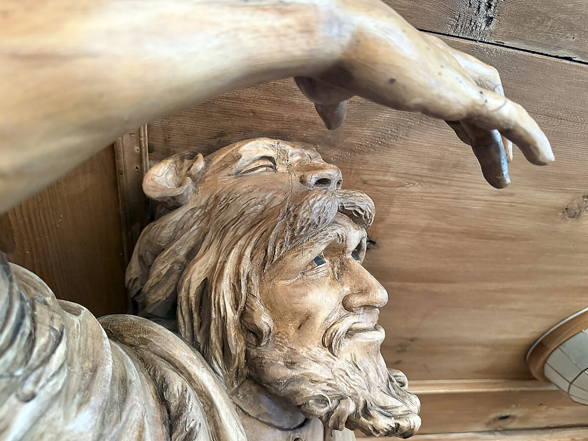 Eine der prägnantesten Figuren empfängt uns gleich am Eingang: Ein Mann mit zerschlissener Kleidung, auf dem Kopf eine Eselsmütze, den Leib umhüllt von Eselsleder. Sein pockennarbiges Gesicht blickt trotzig zur Seite – Faulheit und Dummheit verkörpert er, mit drastischem Humor geschnitzt. Ihm gegenüber: ein zorniger Mann, mit geballter Faust und verzerrtem Gesicht – Auflehnung pur, und, so sagt man, ein Selbstporträt Stilps.