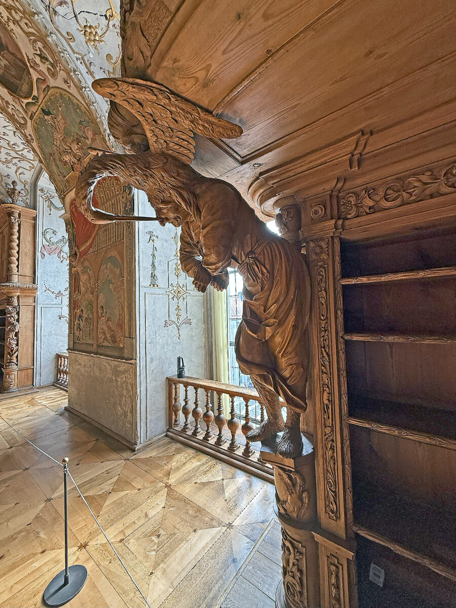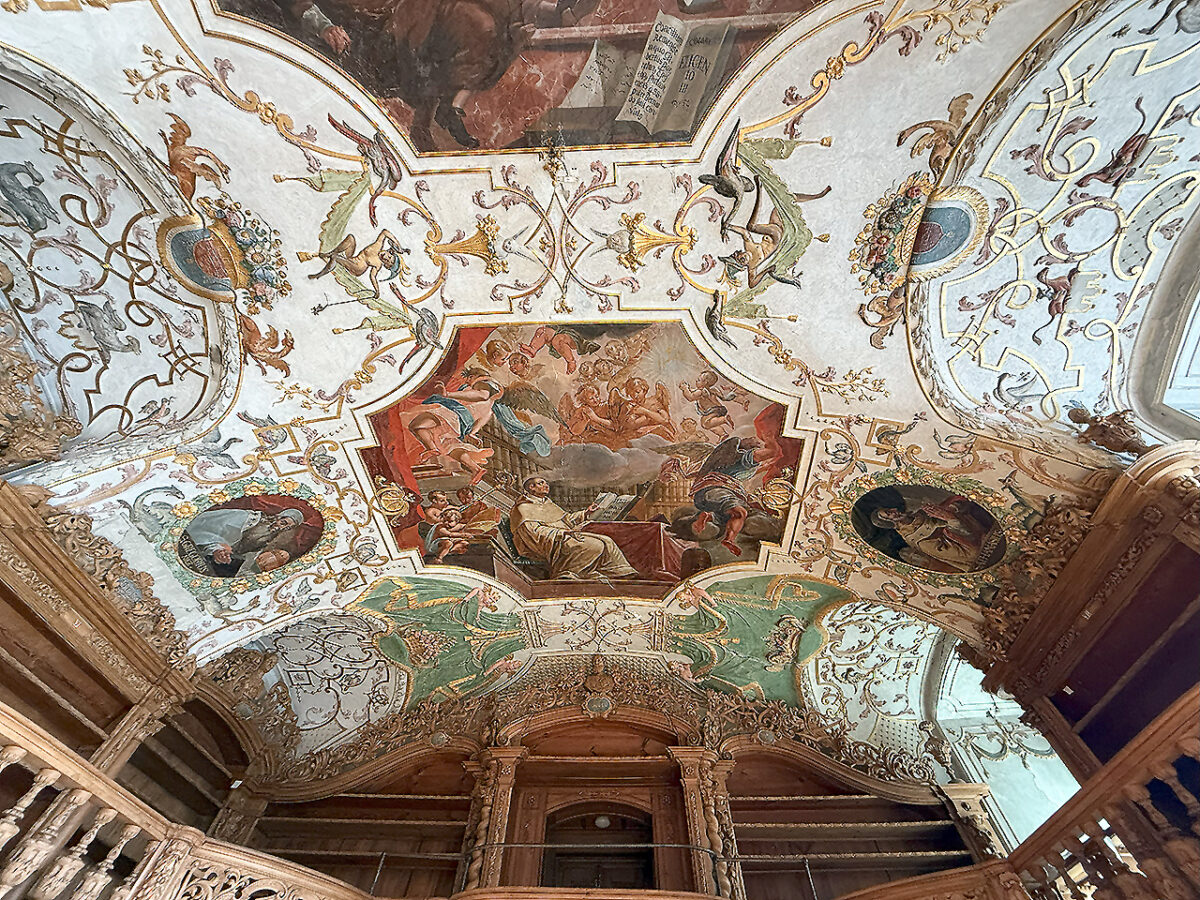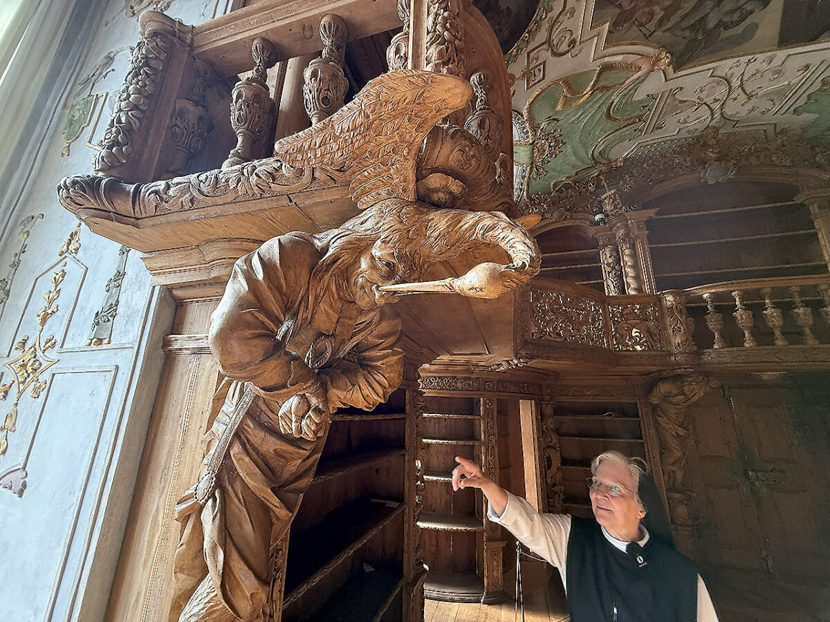 All diese Figuren tragen – im wörtlichen wie übertragenen Sinn – die Empore der Gelehrsamkeit. Hier, wo rund 20.000 Bücher einst lagerten, von denen heute nur ein Bruchteil verblieben ist – heute vor der großen Restaurierung ausgelagert nach München, schimmert durch alles Prunkhafte eine tiefe Demut: Die Einsicht, dass auch das Wissen nicht frei ist von Eitelkeit, Täuschung und Versuchung.