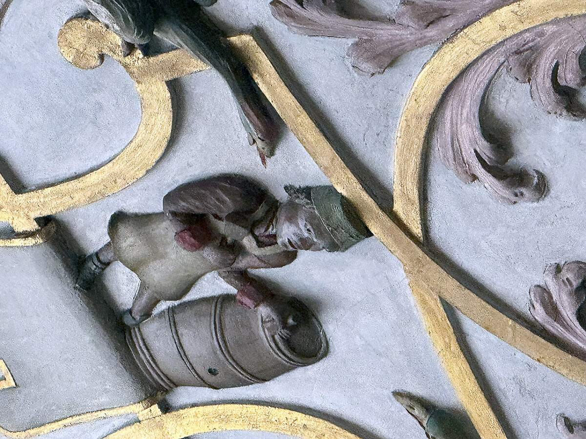 Oben an der Decke das Weinmännlein, das trunken vor Lust zum Genießen taumelt, gegenüber das Biermännlein, das sich tief in die Maß versenkt hat. Dazwischen ein Pfeifenraucher, ein Gaukler, ein Trompeter – Allegorien eines Alltags, der zwischen Hochmut und Heiterkeit pendelt.