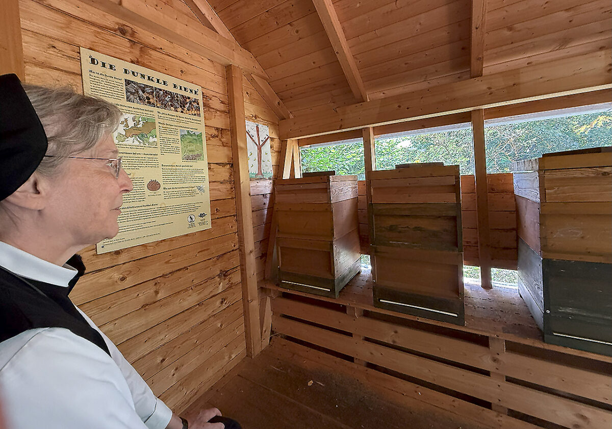 Das Summen unzähliger Bienen wird lauter. Wir steigen in eine Art Bauwagen mit geschütztem Blick auf die Bienenstöcke. Äbtissin Laetitia Fech legt die Hand auf die hölzernen Deckel an den Fenstern. „Spüren Sie das? Es ist wie ein Ohm – ein Summen aus tausend Flügeln.“ Der Klang des Bienenvolks ist mehr als Naturgeräusch – er ist Meditation, Klangraum der Stille, Gebet ohne Worte.