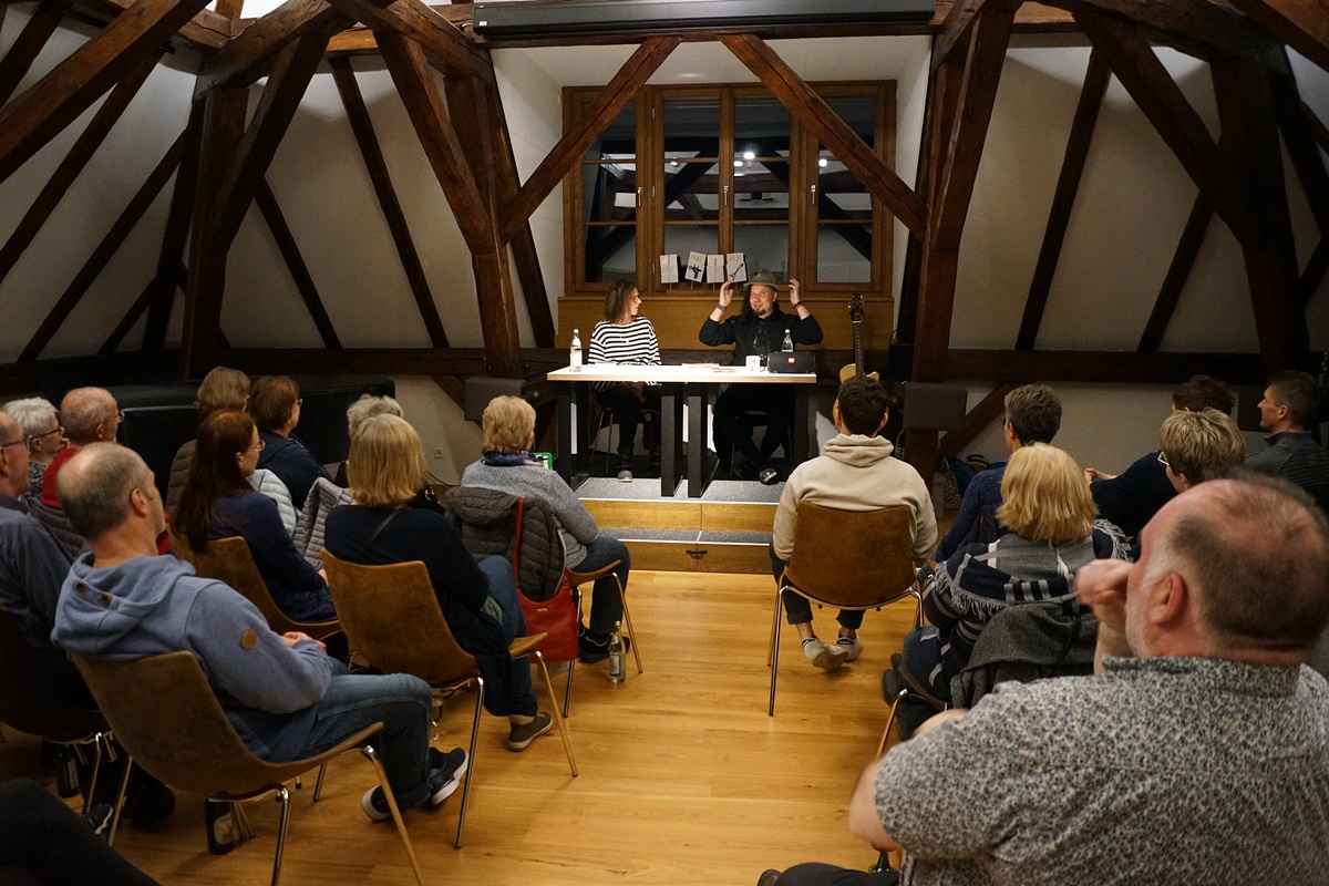 Petra Danzer, Leiterin der Stadtbibliothek Eschenbach hatte schon etwas Bedenken, ob diese Art der Unterhaltung in Eschenbach angenommen wird. Doch bereits vor der eigentlichen Veranstaltung waren die 50 Karten fast alle weg. So mussten zusätzliche Stühle herangeschafft werden und Antonia Vitz und Daniel Gumo Reiss starteten fast pünktlich mit ihrem Programm.