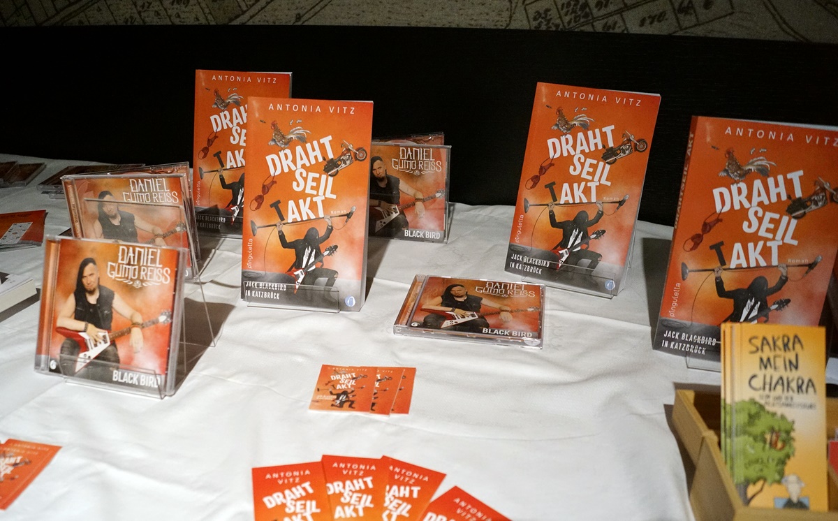 Vitz, mit bürgerlichem Namen Andrea Mössinger, stammt aus Steinberg am See und hat sich vor einigen Jahren als Autorin versucht. 2019 entstand das erste Buch, nun sind es bereits vier, das Nächste liegt bereits fertig in der Schublade. Mit dem Roman „Drahtseil(t)akt“ ist sie viel unterwegs und Reiss ist mit dabei. Der Trash-Metall-Gitarrist und Songschreiber aus Regensburg passt wie die sogenannte „Faust aufs Auge“ dazu. Jedes der zwölf Kapitel ist mit einem Song beschrieben und es gibt auch eine CD zum Buch.
