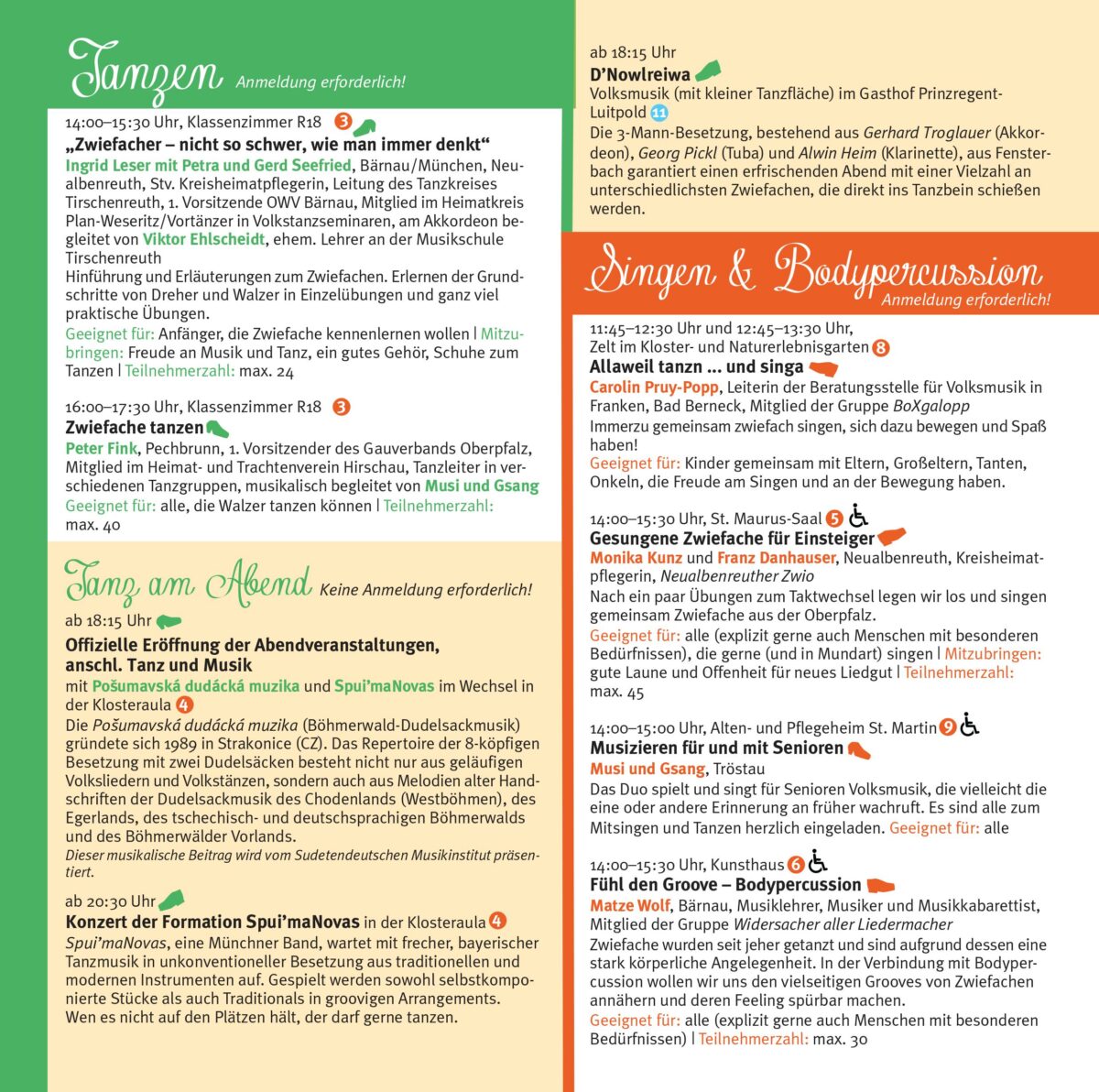 Die taktwechselnde Tanzform „Zwiefacher“ ist seit 2016 Teil des Landes- und des Bundesverzeichnisses des Immateriellen Kulturerbes und soll am 13. Mai erlebbar gemacht werden. Dabei werden in mehrfacher Hinsicht Grenzen überschritten: Referenten und Musikgruppen aus Tschechien und Franken, ein Liedermacher und eine Tradimix-Band, sie alle bringen ihre Interpretation des Zwiefachen ein. Der wichtigste Teil eines Zwiefachentags sind die lokalen Besonderheiten und die Menschen vor Ort. So entsteht ein Projekt aus und für die Region und darüber hinaus.