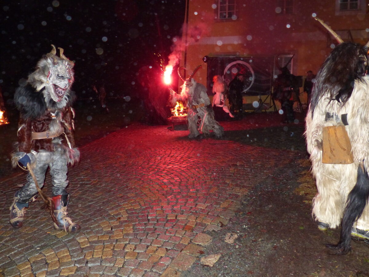 “Ein Höhepunkt dieser Dorfweihnacht, die um 16.30 Uhr begann, waren die „Flossboch Deifl`n“, die Perchten.” Die Perchten traten erstmals in Michldorf auf, sie trugen Glocken am Körper und setzten bei ihrem Auftritt auch kunstvolle Feuerelemente ein. Die Masken wirkten eindrucksvoll, und viele Kinder stellten sich für ein Selfie mit den Deifln an.