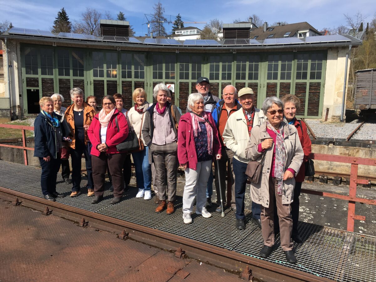 Vorsitzende Christa Heidrich organisierte beim Verein Amberger Kaolinbahn einen Besuch. Auf dem erweiterten Bahngelände in der Innenstadt haben sich eisenbahnaffine Freunde von schon in die Jahre gekommenen Schienenfahrzeugen zusammengetan, um der Öffentlichkeit das Flair und die Romantik des Eisenbahnwesens nahezubringen. Der seit 2010 bestehende Verein hat in seiner Vereinsgeschichte begonnen mit der Rodung und ersten Vorbereitungen des DB-Geländes. Der erste Meilenstein war die Inbetriebnahme der Drehscheibe für die Lokomotiven, mit der die Zugmaschinen nach Einfahrt in den Bahnhof wieder in die richtige Ausfahrtposition gebracht wurden.