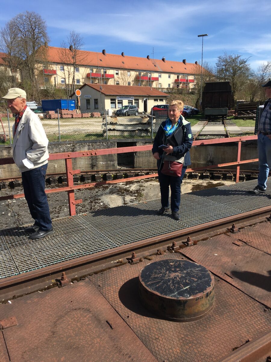 Das Highlight des Besuchs war eine Fahrt auf der Drehscheibe für die Lokomotiven, mit der diese nach Einfahrt ins Betriebsgelände wieder in die richtige Ausfahrtrichtung gedreht werden konnten. Für die mitfahrenden Besucher bestand hier keine Gefahr, schwindlig zu werden, der Maschinist wählte für die Drehungen eine angenehme Geschwindigkeit. Um die gewonnenen Eindrücke zu besprechen, kam auf der Rückreise das Café Hiltner in Amberg geradezu recht.