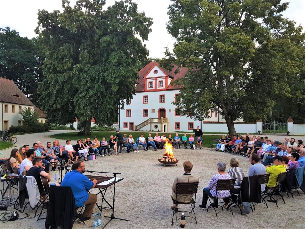 Die Kulisse hätte nicht stimmungsvoller sein können. Das knisternde Lagerfeuer und die bunt illuminierten Wirtschaftsgebäude, kombiniert mit dem imposanten Anblick des Schlosses und seiner alten Bäume, schufen eine unvergleichliche Atmosphäre. Ein besonderer Dank galt dem Hausherrn Maximilian Freiherr von Grundherr. Er stellte nicht nur den idyllischen Ort zur Verfügung, sondern war auch maßgeblich an den Vorbereitungen beteiligt.