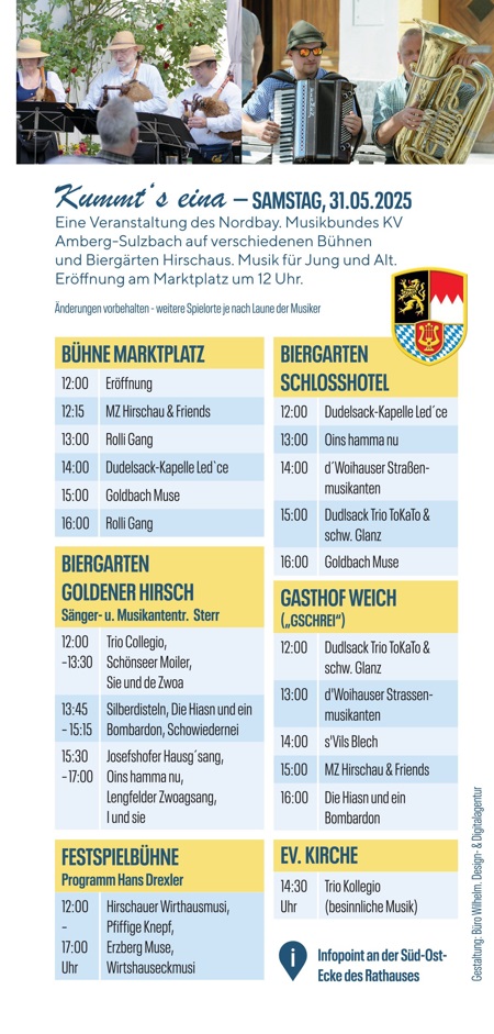 Um 12 Uhr wird das Volksmusikfest „Kummt’s eina“, bei dem 24 Solisten sowie Gesangs- und Musikgruppen auf verschiedenen Bühnen und Biergärten auftreten werden, eröffnet. Zum Ausklang ist ab 20 Uhr eine Sommernachtsparty mit karibischem Flair, DJ und Cocktails am Beach Monte Kaolino geplant.