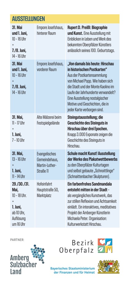 Am Wochenende von Freitag, 30. Mai, bis Sonntag, 1. Juni, verwandelt sich Hirschau im Landkreis Amberg-Sulzbach in eine große Bühne für Kultur, Musik, Kunst und Geschichte: Die 7. Oberpfälzer Kulturtage, die der Oberpfälzer Kulturbund im zweijährigen Turnus gemeinsam mit einer Kommune veranstaltet, bieten ein vielseitiges Programm mit einigen Höhenpunkten für die ganze Familie. Schirmherr des Events ist Bezirkstagspräsident Franz Löffler.