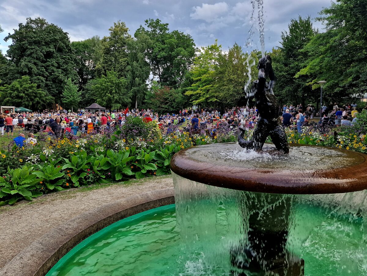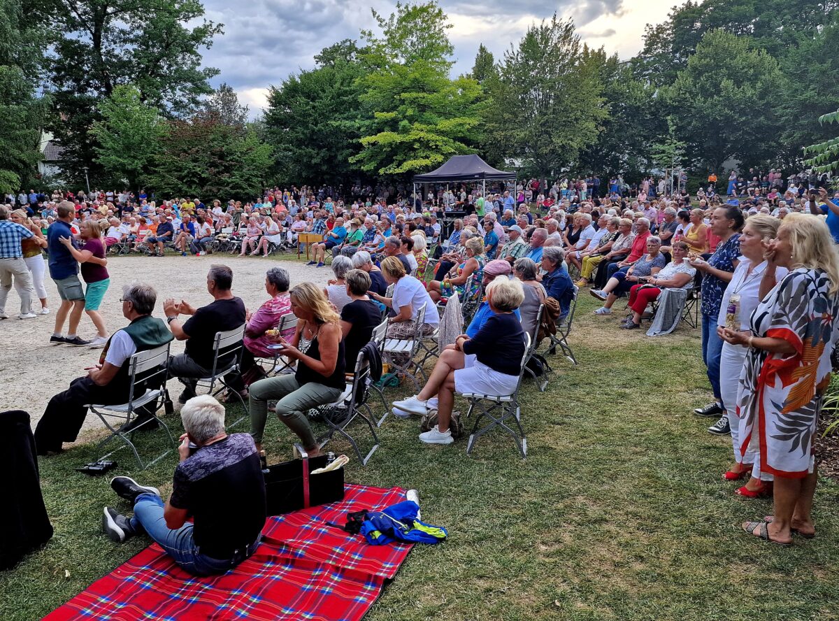 Und wieder einmal war der Rasen vor der Bühne bestens besetzt. Zwar zogen schwarze Wolken auf, doch noch rieselte keine Regen, der tropfte erst gegen Ende der tollen Show. Ihre Vorträge handelten von früheren Jahren, aus den 1960er und 1970er Jahren. Gleich von Beginn an zauberte die Band Stimmung und Emotionen ins Publikum. Sie performte besonders durch ihren amerikanischen Leadsänger Rick Britton aus Vilseck – live und authentisch. Unterstützt wird er dabei durch einen mehrstimmigen Satzgesang der restlichen Bandmitglieder.