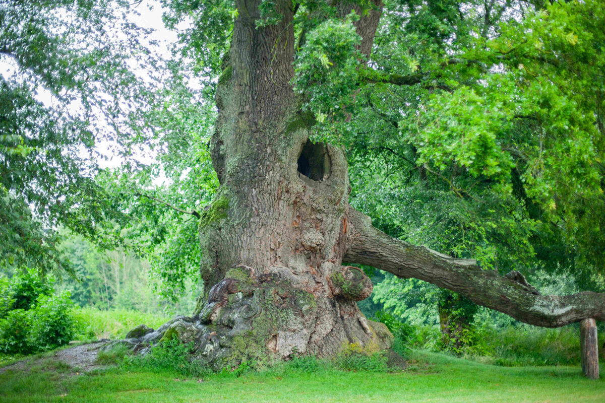 Bei Schloss Haus in der Nähe von Neueglofsheim trifft man auf die St. Wolfgangseiche. Sie gehört zu den 10 größten Stieleichen Deutschlands und ist das stärkste Exemplar in Bayern. Der Stammumfang des bajuwarischen Methusalems beträgt über 9 Meter, Schätzungen über das Alter gehen bis zu 1000 Jahren. Ein Ast, der waagrecht vom Stamm weggeht, ist bereits seit über 100 Jahren mit einem Holzpfosten abgestützt. Einer Legende nach hat der heilige Sankt Wolfgang wortgewaltig auf diesem Ast stehend gepredigt. Mindestens zweimal hat ein Brand den Baum heimgesucht, zuletzt am 31.10.1909, ironischerweise genau am Jahrestag des Sankt Wolfgang. Von ihrer ehrfurchtsvollen und vitalen Wirkung auf den Betrachter hat sie dadurch Gott sei Dank nichts eingebüßt.