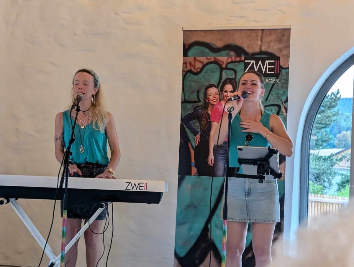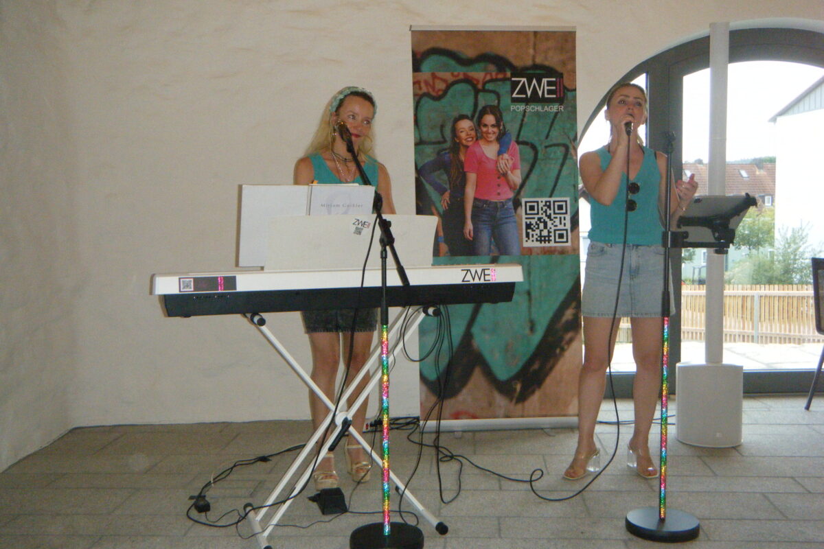 Zum ersten Mal gestaltete das Duo ZWEII den musikalischen Teil des Abends. Judith und Miriam Geissler verzauberten von Anfang an mit ihrer Ausstrahlung und ihren Stimmen. Eröffnet wurde die Veranstaltung mit dem Lied “Für Dich soll’s rote Rosen regnen” von Hildegard Knef, gefolgt von Eigenkompositionen wie “Schattenkristall”, “Du bist mein schönstes Rendezvous”, “Über dem Regenbogen”, “Augen auf”, “Zwei zu sein”, “Total geflasht”.