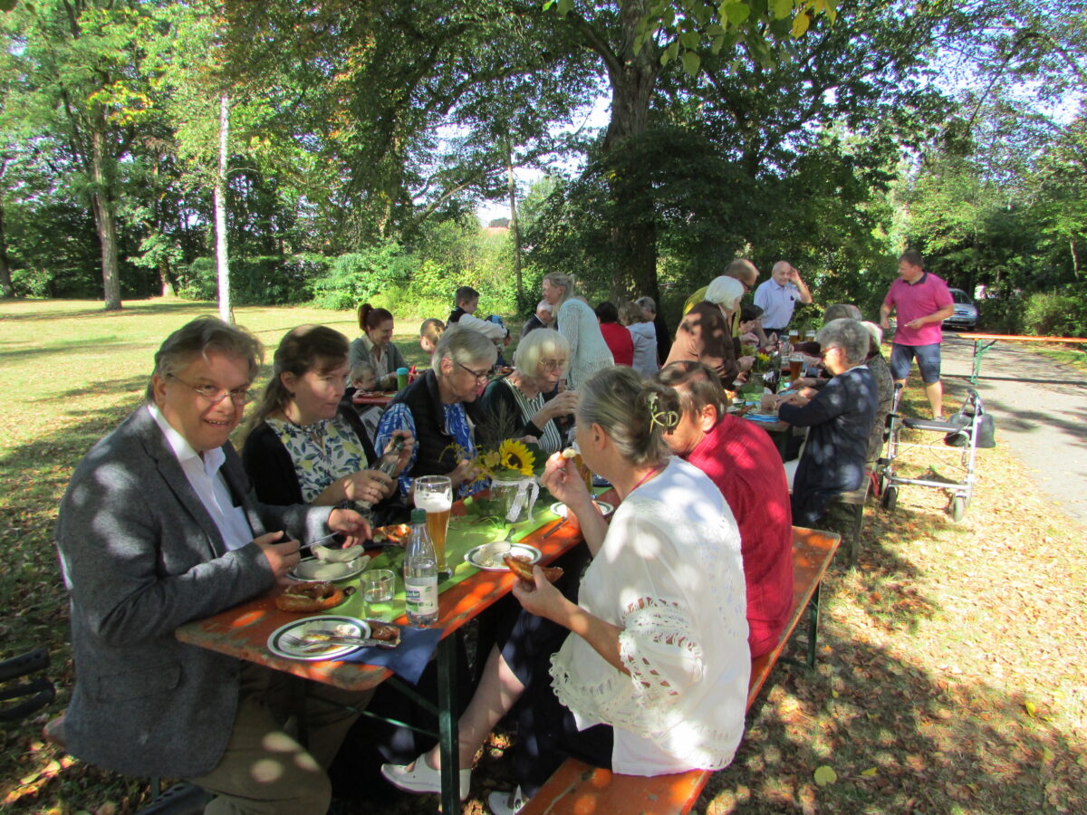 Nach dem bewegenden Gottesdienst lud der Förderverein St. Moritz unter der Leitung von Harald Puckschamel zu einem festlichen Weißwurstfrühstück ein, welches im Rahmen des 25-jähriges Bestehens des Vereins organisiert wurde. Bei herrlichem Herbstwetter genossen gut 70 Gäste die bayerische Spezialität, begleitet von Brezen, Weißbier und alkoholfreien Getränken, noch bevor die Kirchenglocken 12 Uhr läuteten. Die Musikalische Begleitung im Gottesdienst übernahm Simon Hoffmann an der Orgel, der die von den Gläubigen gesungenen Lieder mit großer Hingabe begleitete.