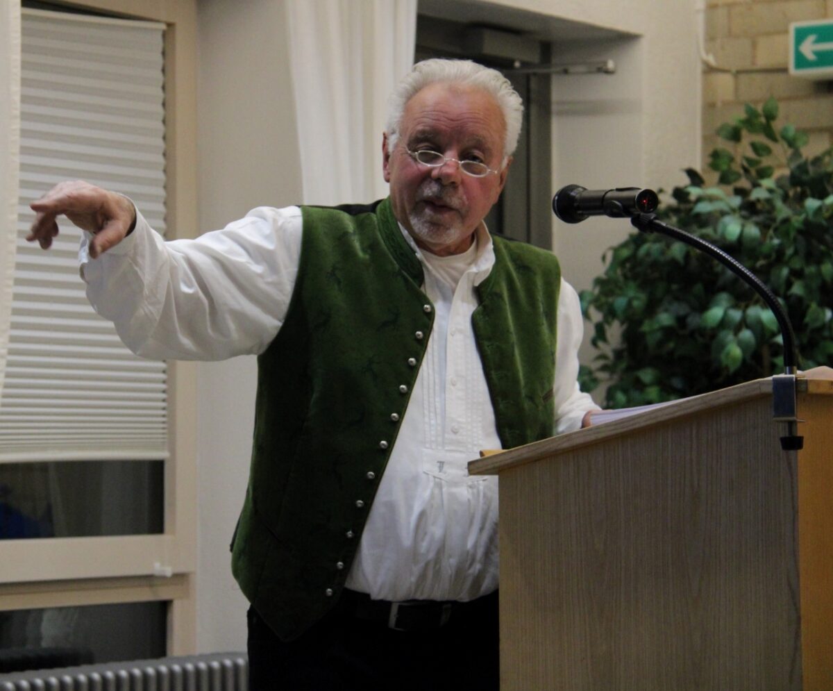„Seit Gründung der Stadt gibt es nachweislich eine Bürgerwehr“, blickte der Autor auf die Anfänge Neustadts zurück und erzählte von der Nachrichtenbörse im Flur des Alten Schlosses, in dem zu seiner Kinder- und Jugendzeit das Schreibwarengeschäft von Hans Bogner untergebracht war. Dort erzählten „die Alten“ von früher, auch vom großen Heimatfest 1923, als sich die Bürgerwehr wieder formierte. Fritsch las viele Passagen aus seinem Buch und schmückte die Erlebnisse zur 750-Jahr-Feier der Stadt, als seine Bürgerwehr erstmals wieder an die Öffentlichkeit trat und mit ihren Auftritten für großes Aufsehen sorgte, mit kleinen Anekdoten aus.