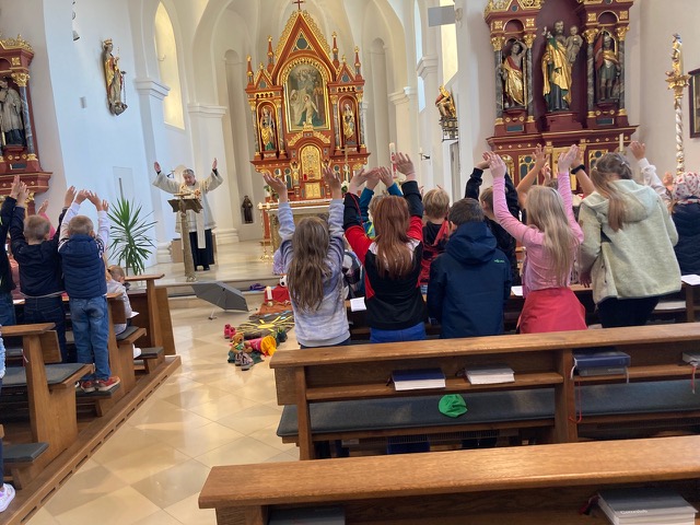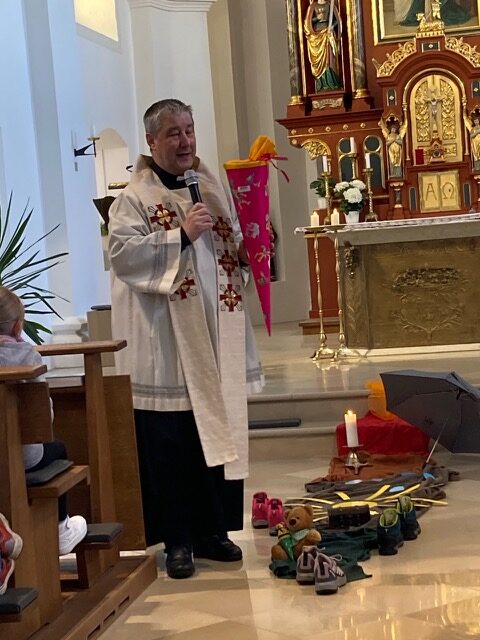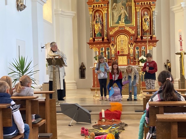 Mit dem Lied “Danke für diesen guten Morgen” beginnt die kirchliche Feier und alle singen dazu. Vor den Stufen zum Volksaltar sind verschiedene Gegenstände, die man für die Schule braucht, aufgebaut. Pfarrer Nieciecki geht einzeln darauf ein und fragt die Kinder, warum sie Schuhe, die Schultüte, den kleinen Bären, den Regenschirm, das Kreuz, die Sonne und vieles mehr brauchen. “Er bekommt von den Kindern ausreichend Antworten dazu”, berichtet Sieglinde Schärtl.