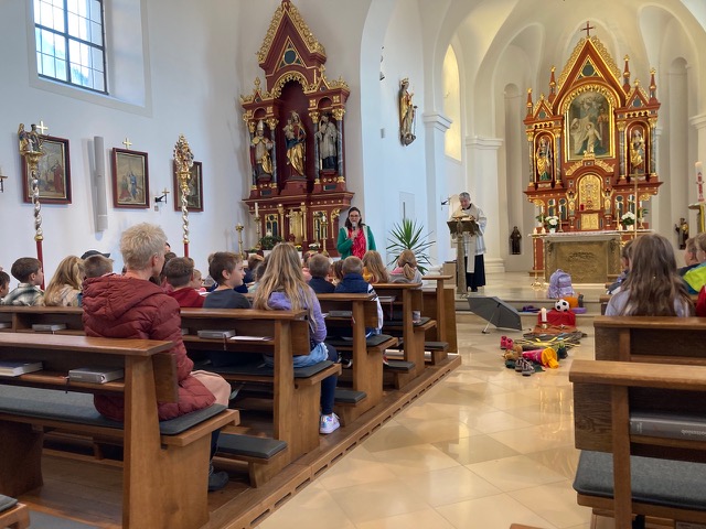 Die Kinder tragen vor dem Altar das Kyrie und die Fürbitten vor und stellen die wichtigen Sachen aus ihren gepackten Schulranzen vor. Schulleiterin Katja Meidenbauer dankt der Lehrerschaft und dem Pfarrer. Sie lobt, dass es ihnen hervorragend gelingt, den Kindern Gott näherzubringen: “denn zum Lernen braucht man auch Gott.”
