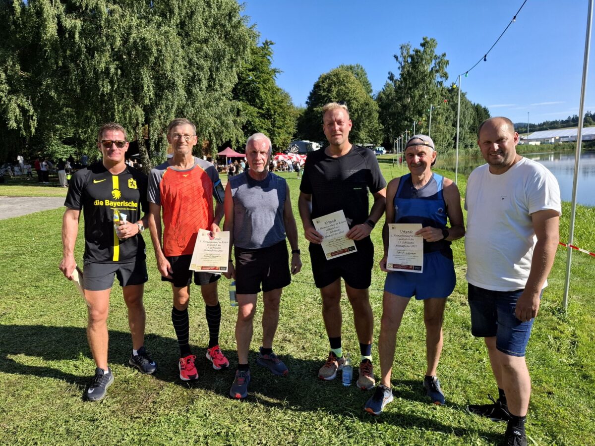 Nach 41 Minuten bog der 70-jährige Robert Lobinger aus Freihung bei Grafenwöhr in das Freizeitgelände ein und wurde Erster. “Es war knallhart bei der Hitze und forderte von allem besondere Anforderungen”, so der schweißgebadete Mann aus Freihung. Der Hobbyläufer beteiligt sich einmal im Jahr am Landkreislauf Amberg-Sulzbach und läuft auch privat öfter. Wenige Sekunden danach kam der 38-jährige Eslarner Dominik Hanauer ins Ziel. Auch er geht zweimal in der Woche auf die Strecke und ist ein geübter Läufer. Den dritten Platz belegte Stefan Ittner aus Eslarn, der sich gerne an einem Laufevent beteiligt. Wacker geschlagen haben sich auch die Mädels vom Grießlhof aus Burkhardsrieth. Zur Erinnerung händigten die Organisatoren allen eine Urkunde und eine Biermarke für einen Besuch im Festzelt aus. Nach Ansicht aller sollte der Heimatfestlauf auch künftig angeboten und zur Tradition werden.