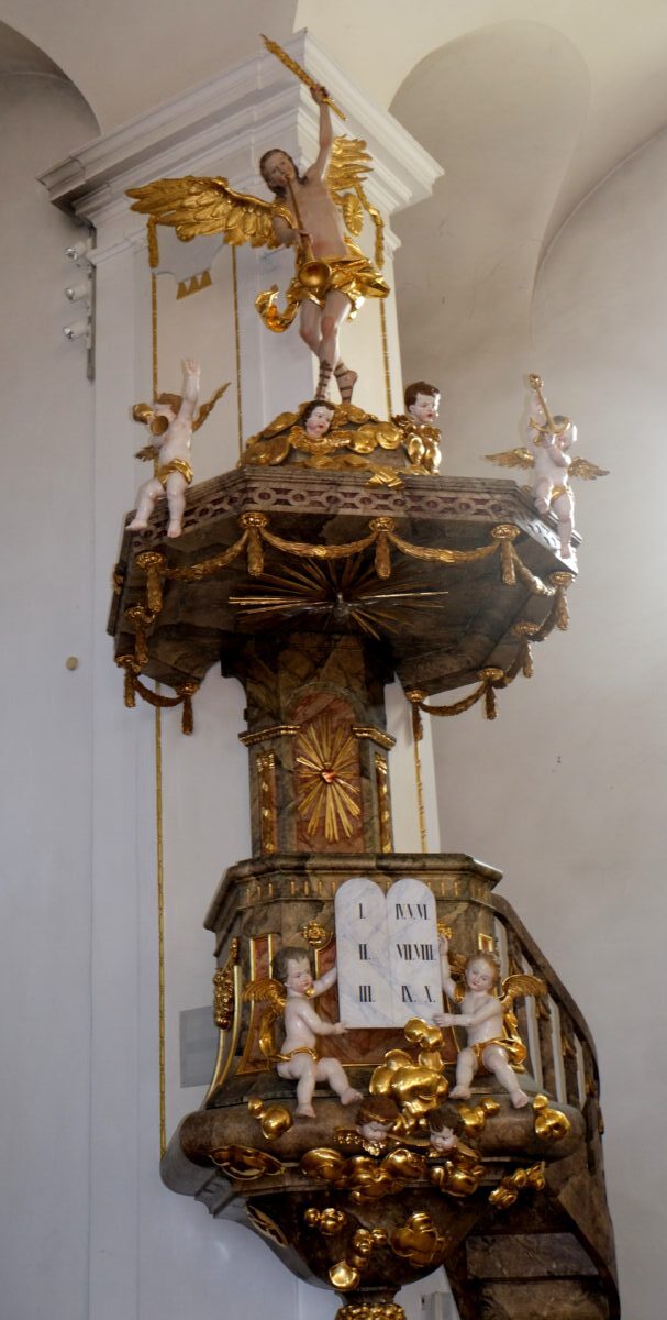 Als Entstehungszeit wird das Ende des 18. Jahrhunderts angenommen. Die Kanzel trägt bereits klassizistische Merkmale. Die Symbole sind auf die Verkündigung abgestellt. Zwei Engel zeigen die Tafel der Zehn Gebote – der eine mit dem Hoffnungsanker, der andere mit einem Kelch, dem Symbol der Liebe Christi. Ganz oben der Erzengel Michael mit Trompete und Flammenschwert: Er ruft uns zur Entscheidung für Gott auf, der seinem Sohn das Gericht über Lebende und Tote übertragen hat.