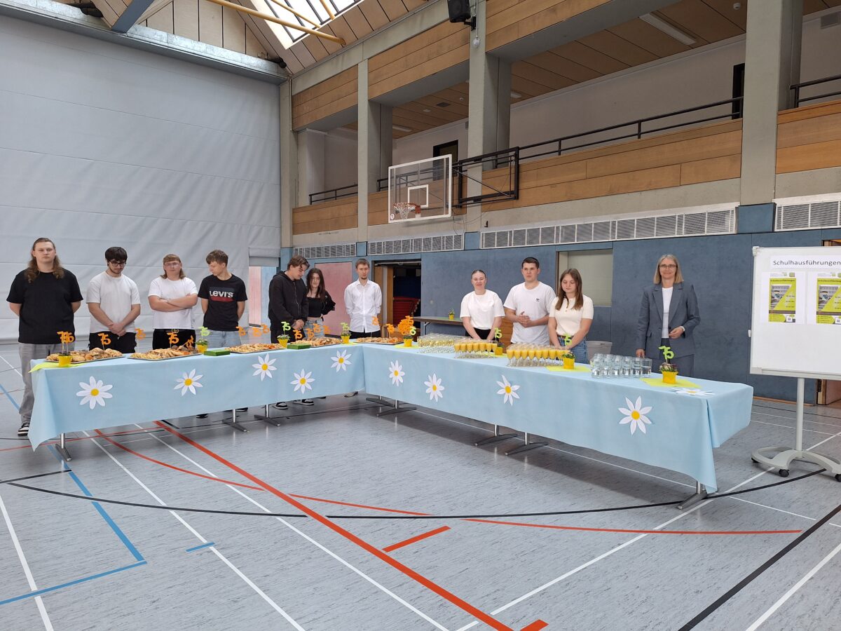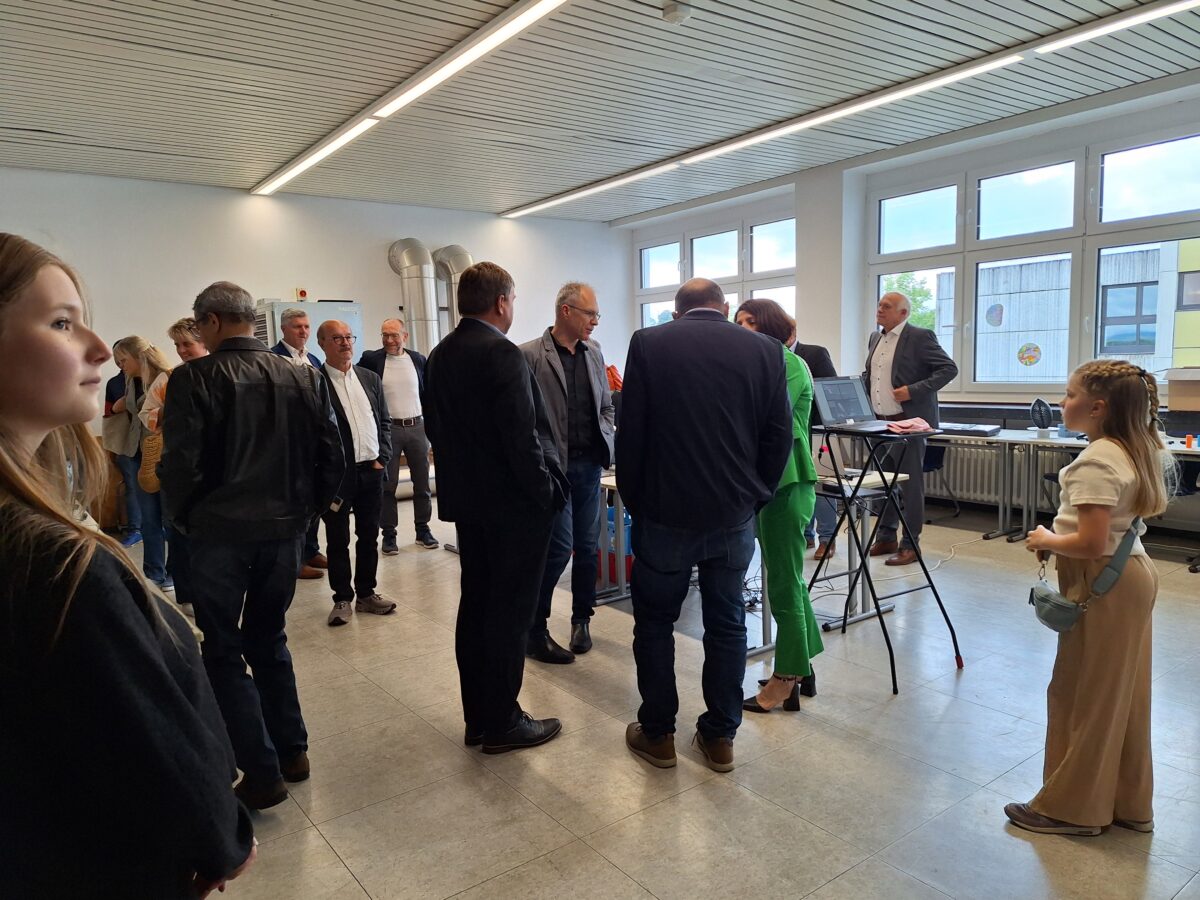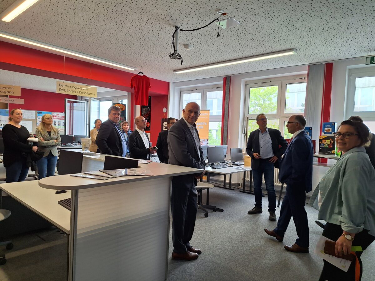 Mit einem herzlichen Dankeschön an die Organisatorin Spitaler, die einen Blumenstrauß erhielt, schloss Bauer den offiziellen Teil der Feierlichkeiten. Anschließend lud die Klasse 11 Z zu einem Sektempfang mit Häppchen ein, der den Gästen Gelegenheit zum ungezwungenen Austausch bot. Die Gäste wurden durch das Schulhaus geführt, wo sie in verschiedenen Räumen die Geschichte der Schule, die Entwicklung der technischen Ausstattung, die Gestaltung der neuen Module, den Ganztagsbereich sowie die Räumlichkeiten des Übungsunternehmens bewundern konnten.