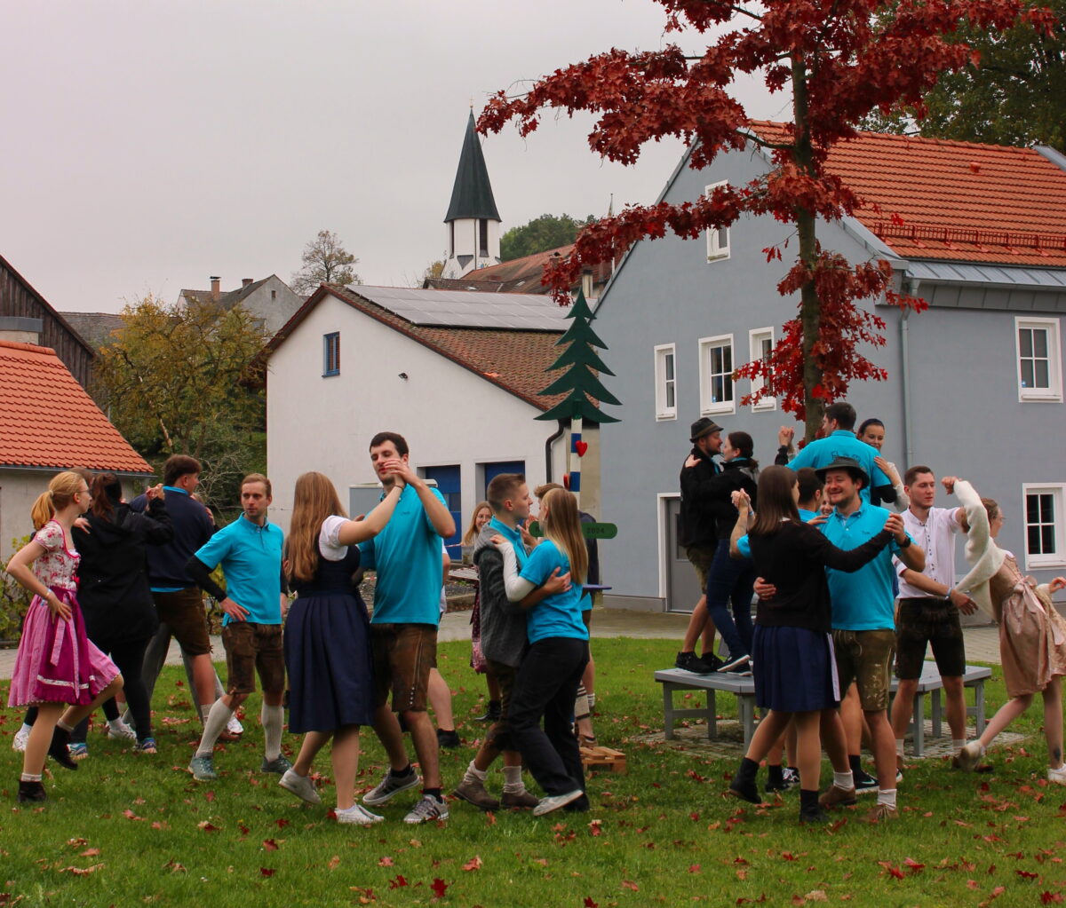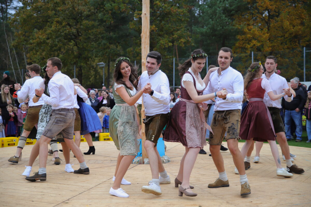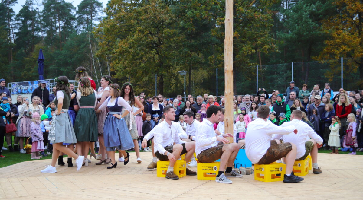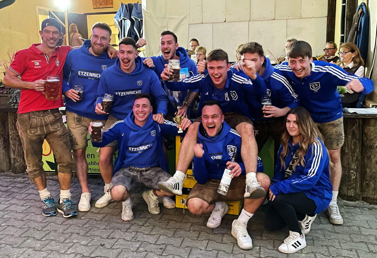 Moderator und Sprecher Mäx Rösch von den Etzenrichter Kirwaleit bilanzierte den Samstagabend so: „Die Fete war ein absolutes Highlight in diesem Jahr, das war wirklich ein absoluter Brecher für unsere Kirwa und wir sind uns einig, dass wir alles richtig gemacht haben, da ist der Schweiß von der Decke getropft“. Dabei war von den Klubmitgliedern der Kirwaleit eine große Portion Kondition gefordert. Samstag 10 Uhr zogen die jungen Leute von der Schustergasse los und trafen am Nachmittag auf dem SV-Gelände ein. Zwischendurch gab es immer wieder Musik und Tänze auf den mit Umwegen gespickten Fußmarsch. Fans, befreundete Familien aber auch das EDEKA-Team sorgten für Stärkungen aller Art. Markantester Zwischenstopp war der Dorfplatz, mit einer Serie von Tänzen um die mit wunderschönem roten Laub geschmückte Sumpfeiche. Diese hatten die „Kirwaleit“ 2016 selbst gesponsert, mittlerweile ist es ein zentrales Schmuckstück auf dem Areal mitten im Dorf. Von der Chronologie her folgte „König Fußball“ mit dem Schlagerspiel der Bezirksliga-Truppe gegen die punktgleiche zweite Mannschaft der SpVgg Weiden. Auch hier konnte das Stimmungsbarometer nach oben bewegt werden, am Ende stand ein 1:0-Sieg der Gastgeber auf der Anzeigentafel. Die SVE-Reserve, aktueller Tabellenführer in der A-Klasse Nord musste leider mit der Absage des Gegners Eschenfelden wegen Personalmangel leben.