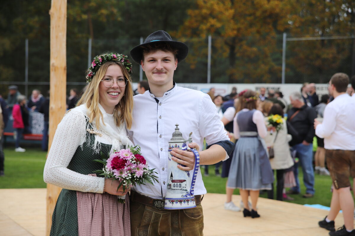 Waren beim Fußball 220 Fans dabei, so steigerte sich die Zuschauerzahl am Sonntagnachmittag auf mindestens das Doppelte. Den Auftakt bei den Tanzeinlagen lieferten die Jüngsten, die Mädchen und Jungen aus dem Waldkindergarten und dem konventionellen Kiga zeigten unisono Talent beim Kreisen um den mobilen, auf dem Rasen installierten Kirwabaum bei bayerischer Musik begleitet von den „Holweglauerern“ alias Beßenreuther-Brothers. Danach folge der tänzerische Auftritt der offenbar gut trainierten zehn Kirwatanzpaare. Höhepunkt und Ende deren gekonnten Beiträge war das Festlegen des Oberkirwapaares. Der Strauß kreiste und landet bei Saskia und Simon. Simon Kostial und Saskia Zupfer, so ihre vollständigen Namen.