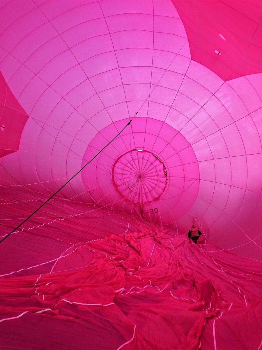 Am Dienstagabend schien dann zwar die Sonne und es war trocken, allerdings war es der Wind, der den Schweizer Piloten Eugen Nussbaumer am Start des Euters zweifeln ließ. Das Euter ist nämlich ein pinker Heißluftballon in Form eines überdimensionalen Kuheuters mit Passagierkorb– und an ein Aufsteigen war vom Maiersreuther Dorfanger aus vorerst nicht zu denken. So blieb Zeit für das Gespräch mit der Künstlerin. „Es war von Anfang an klar, dass das ein Longterm-Projekt wird“, so Husar.