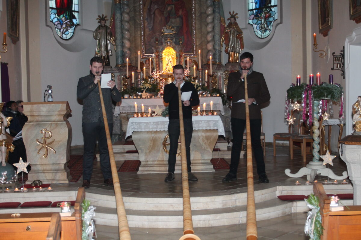 „Wie Sterne können auch wir Menschen uns anstrahlen“, hieß es unter anderem vom Frauenbund. Dazu passte die Bitte: „Schauen Sie sich um, lächeln Sie sich zu, vielleicht winken Sie mit dem kleinen Stern in der Hand.“ Inzwischen war es draußen bereits dunkel geworden. Darauf hatten die Alphornbläser mit „Es wird scho glei dumpa“ hingewiesen.