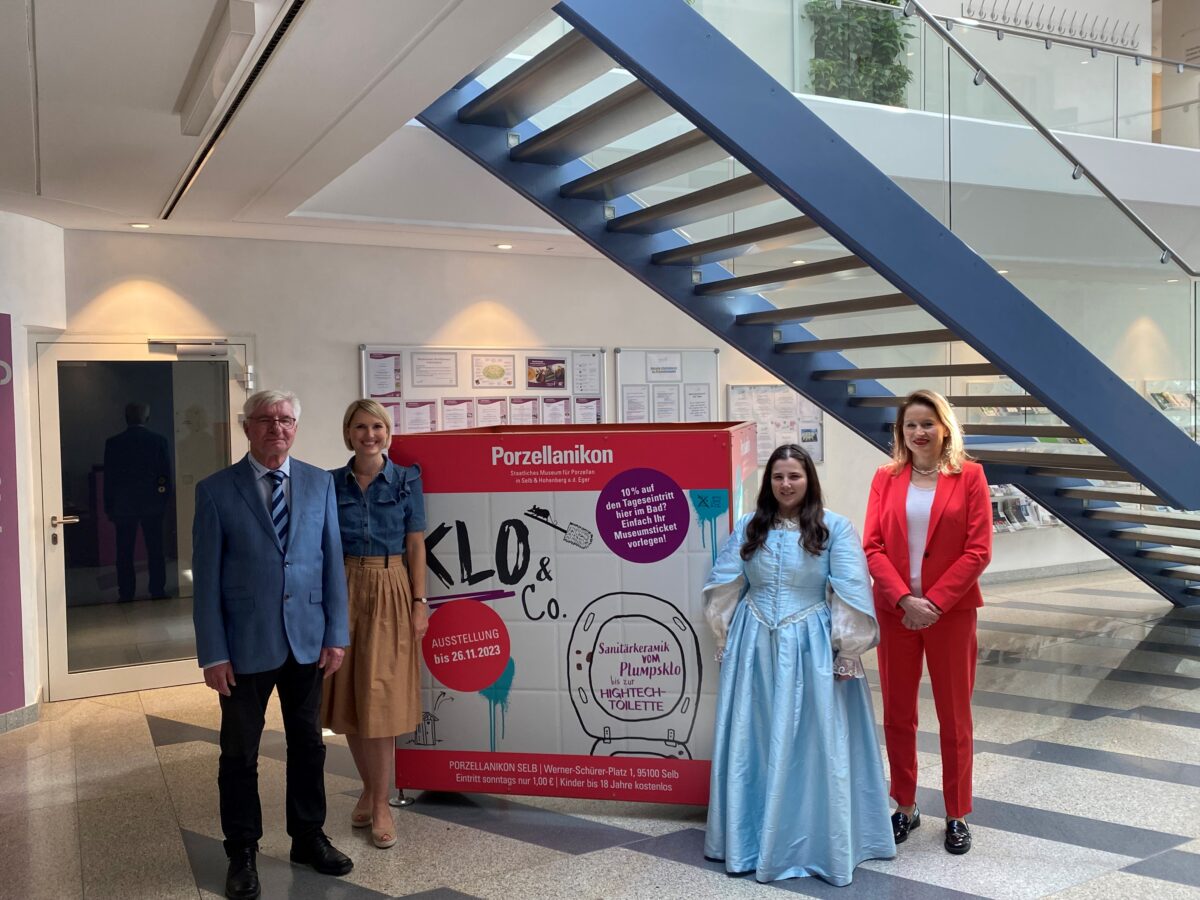 Der Werbewürfel des Porzellanikon – Staatliches Museum für Porzellan ist an seiner dritten Station angekommen. Er steht im Eingangsfoyer des Sibyllenbades und macht auf die beiden aktuellen Sonderausstellung des Museums aufmerksam: “Luxus, Wellness, Porzellan – Ein Tag im böhmischen Kurbad” im Porzellanikon Hohenberg a.d. Eger und “Klo & Co. Sanitärkeramik vom Plumpsklo bis zur Hightech-Toilette” im Porzellanikon Selb. Beide Sonderschauen haben gemeinsame Themen: Gesundheit, Wasser und Wellness.